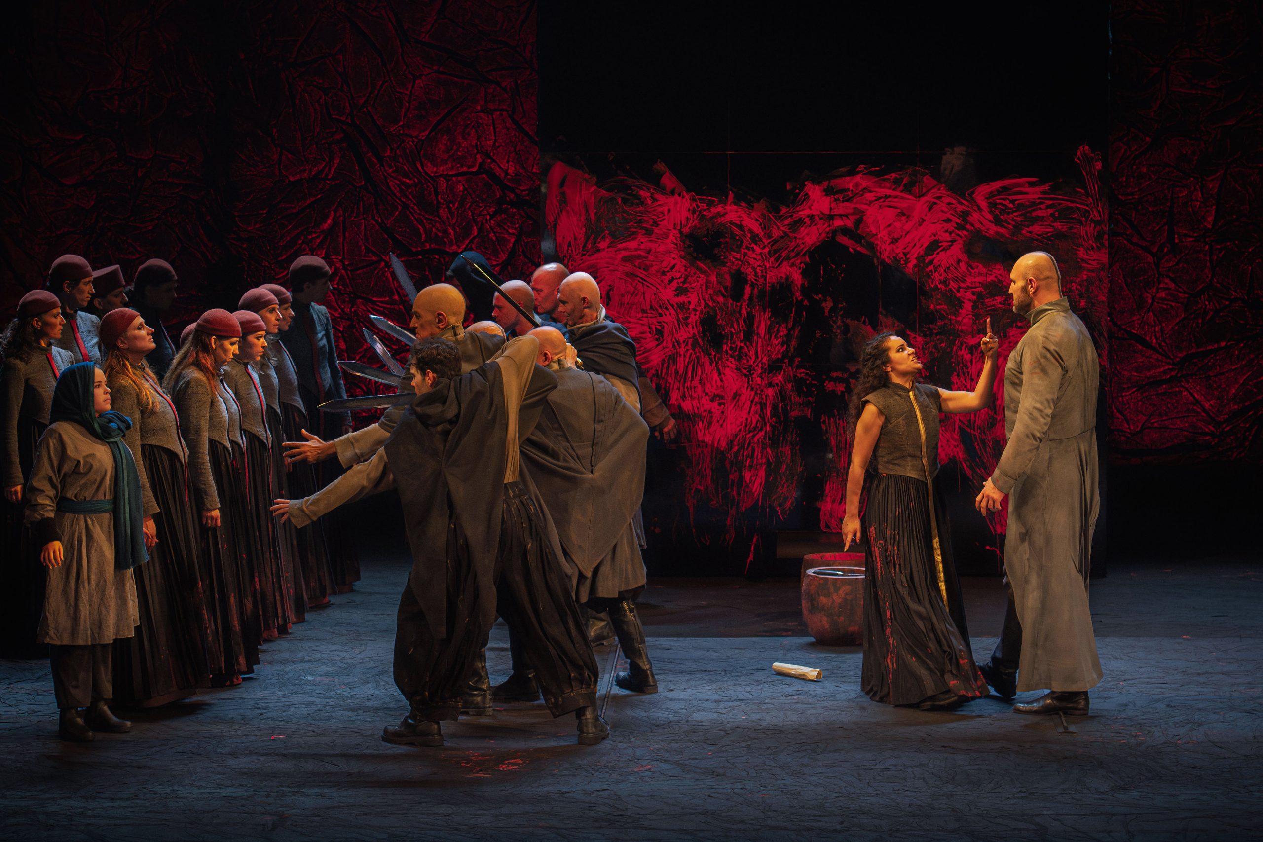 Jean-Fernand Setti (Thoas), Tamara Bounazou (Iphigénie), chœur Les Eléments © S. Brion / Opéra Comique
