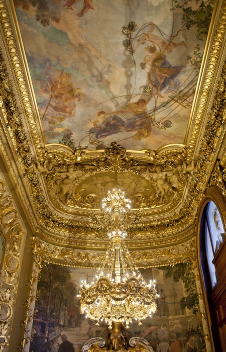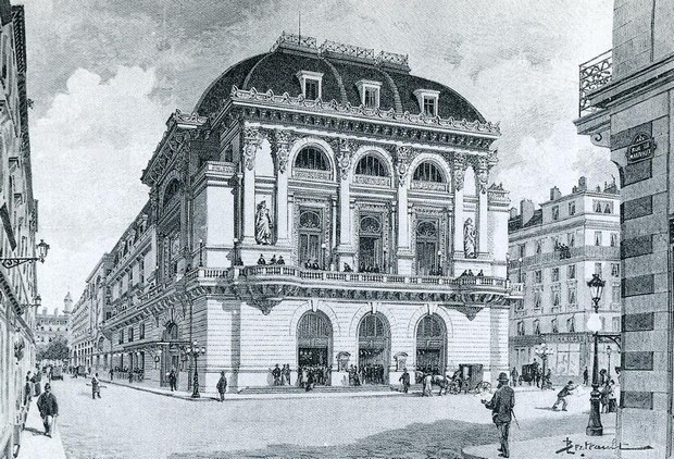 Institution presque tricentenaire, l’Opéra Comique s’est installé en 1783 sur un terrain cédé par le Duc de Choiseul, à proximité du Boulevard des Italiens. Appelé salle Favart - du nom du librettiste Charles-Simon Favart (1710-1792) - le bâtiment fut deux fois incendié (en 1838 et 1887), et deux fois reconstruit sur le même emplacement. L’actuel théâtre fut édifié en 1898 par l’architecte Louis Bernier (1845-1919) qui, fort des enseignements du passé - les incendies avaient pour origine un éclairage au gaz défectueux - eut la bonne idée de l’équiper de l’électricité et de normes de sécurité modernes. La façade du bâtiment - actuellement cachée à la vue par des échafaudages - qui s’inspire du modèle de Davioud au théâtre du Châtelet, reflète le style néoclassique en vogue, avec ses nombreuses statues allégoriques et caryatides. Mais c’est seulement après avoir passé l’entrée du bâtiment classé au titre des Monuments Historiques depuis 1977, que l’on prend véritablement conscience de l’intérêt du bâtiment, témoignage d’un art et d’une époque.