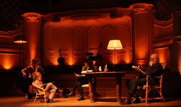 Les confortables chaises, abat-jour, table, bougie, carafe, tableau d'ardoise pour enfant (on notera la jeune présence d'une enfant qui occupe la scène, se promène, fait des dessins...), établissent hélas un décor à la fois sous-utilisé et qui finit par distraire le spectateur, ce qu'accentuent des déplacements spontanés et apparemment peu cadrés, si bien que l'on se demande s'il n'eut pas mieux valu réduire cet appareil à l'essentiel, à savoir à la voix impérieuse et grave de Jean-Pierre Marielle, prisonnier malgré lui de son incarnation mythique de Monsieur de Sainte Colombe, toujours aussi magistral et charismatique, d'une dignité amusée en dépit des années (face auquel Agnès Pontier se révèle clairement en retrait), et à l'archet plein d'émotion de Claire Giardelli qui hélas, n'a pu jouer aucune des Suites dans son intégralité, ce qui confère à l'enchaînement un côté frustrant car trop segmenté et parcellaire.