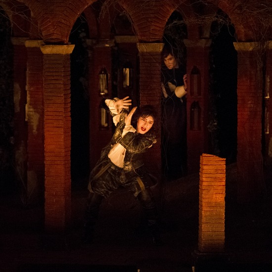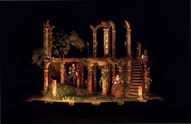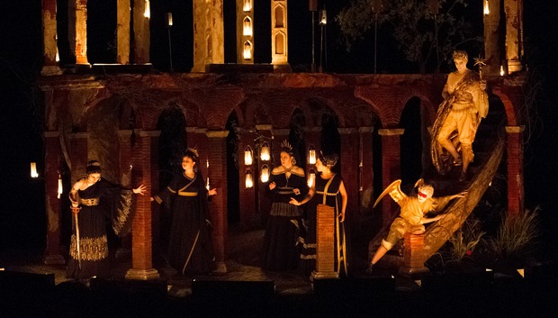 Alors que le livret fait appel à des forêts, des paysages "en partie maritime", le "Bois des Myrtes d'Erebo" ou encore "une cour du palais d'Hipparco", Benjamin Lazar a opté pour l'unité de lieu grâce à une complexe architecture ruinée, dont la rotondité, les arches et l'appareillage de briques ne sont pas sans rappeler le Théâtre d'Eau de la Villa d'Hadrien. C'est sur cet espace circulaire, à deux étages, à moitié envahi par la végétation et qui tourne sur lui même de manière à varier les ambiances ou à accompagner la progression psychologique des personnages, que se meuvent les protagonistes. Le soin apporté à ce décor solitaire et sombre du à Adeline Caron, permet à cet espace unique d'être protéiforme et mystérieux, les 3 escaliers, et les 2 plates-formes n'étant parfois pas éloignés des gravures de Piranèse ou des utopies d'Escher. C'est donc ce labyrinthe décadent et asymétrique qui va permettre la diversité des niveaux grâce au jeu en duplex : les Dieux sur l'étage supérieur, les humains ou les Enfers en dessous, ou rendre crédible les changements fréquents de scène. On louera tout particulièrement la rotation du décor à l'acte 3 pendant la scène de folie d'Egisto, reflet de ses sens altérés. L'esthétique classicisante du décor - que n'aurait pas dédaigné un Hubert Robert - "habille" la modernité du concept, et les habitués des scènes d'Outre-Rhin ou du Théâtre de la Ville se souviendront sans nul doute de multiples mises en scène exploitant ces doubles étages.