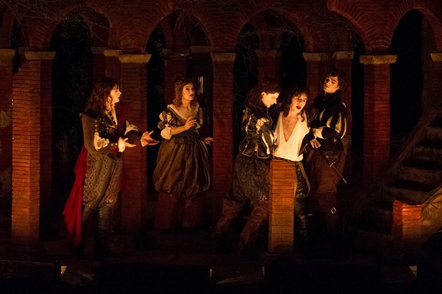 Les costumes d'Alain Blanchot contribuent à un climat de clair-obscur magnifié par l'éclairage à la bougie de Christophe Naillet, qui brouille les contours dans un halo mordoré. En effet, les pourpoints et manches à crevés, de même que la tenue de bergère, semblent sortis d'un Seicento archaïsant, rappellent inconsciemment au spectateur les scènes puissantes du Caravage ou Artemisia Gentileschi ou les doux portraits de Raphaël. La gestuelle et les déplacements mêlent adroitement les codes baroques (personnages de face par exemple) et un certain naturel, au résultat moins hiératique et apprêté que dans la tragédie-lyrique.
