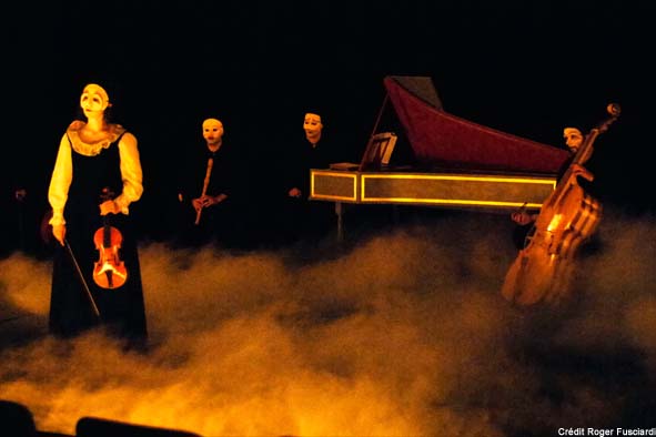 © La Compagnie de Mars Prenant place au milieu des quatre humeurs, la danseuse par ses pas et enchaînements reflète le caractère de chacun des acteurs, qui se livrent, instrument en main, à la démonstration de leur personnalité : le flegmatique au violon, ou le bilieux à la flûte, font entendre des accords tantôt harmonieux, tantôt violents, mimant leur douleur ou leur joie ; des chansons à boire ou une Follia variée en effets sont suivies d’un Flow my tears de Dowland qui tire des accents mélancoliques à souhait de la viole de gambe, avant de céder la place à une Tarentelle… L’esprit suit dans une douce rêverie, favorisée par le halo des bougies, les brusques revirements des musiciens en proie à leurs démons intérieurs. On saluera l'expressivité des musiciens, et les sonorités colorées et chaleureuses - notamment la viole de Federico Yacubsohn) qui entourent la scène, sans oublier les dissonances bienvenues illustrant certains débordements colériques. En fin de partie, c’est la Faucheuse en personne qui traverse la scène emplie de brume au son du violon pour témoigner de la fragilité de l’humaine existence soumise aux aléas de ces "humeurs peccantes". Demeure le sentiment d’avoir expérimenté le temps d’un spectacle total - projet artistique revendiqué par la Compagnie de Mars - l’esprit baroque, ses mouvantes frontières entre les arts, et son essentielle instabilité.