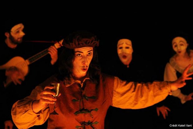 particulier (Ben Jonson, Every Man in His Humour) Sise au fond de l’espace théâtral de la Cartoucherie, l’Epée de bois accueille une création dont le nom évoque les traités médicaux du 17ème siècle, De humanis humoribus. Que les non-latinistes se rassurent, point n’est besoin d’avoir traduit Celse ou étudié Hippocrate pour profiter pleinement d’un spectacle à l’atmosphère enchanteresse. C’est d’abord la douce lumière des bougies et l’éclat mordoré du bois blond du théâtre qui posent un cadre qui n'est pas sans rappeler les partis-pris de Benjamin Lazar ; sur une scène dépouillée (un bureau, un clavecin, cinq chaises), cinq musiciens masqués : voilà campées les quatre humeurs – sang, flegme, bile jaune et bile noire, sans compter la représentation des humeurs unifiées - , vivantes incarnations oniriques d’une théorie médicale issue des textes médicaux de l’Antiquité et promise à la postérité, et aujourd’hui bien ancrée dans l’inconscient collectif. Du Prologue à l’Epilogue se succèdent donc quatre parties, chacune consacrée à l’illustration d’une humeur : s’entremêlent alors avec naturel et poésie textes déclamés, passages de mimes et de jeu, musique (servie avec talent par la jeune Compagnie de Mars) et danse, sans qu’aucun Art ne prenne le pas sur les autres ; la composition générale fait montre d’une harmonie subtile qui n’en souligne que davantage les violents déséquilibres humoraux qui se dévoilent sur scène.