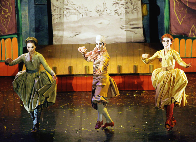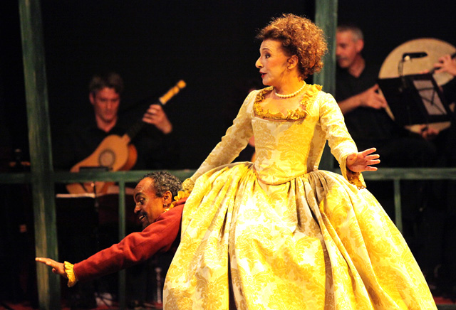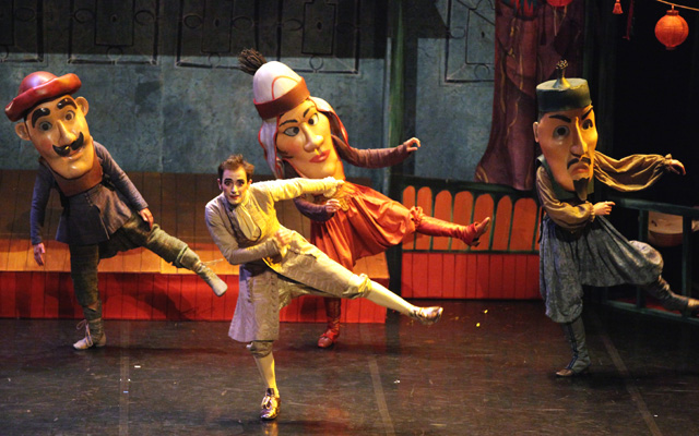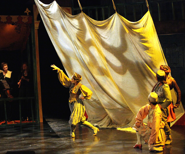 Julien Lubek et 3 "grosses têtes" © Gautier Pallancher Mais revenons au titre du spectacle, "Müsennâ", qui tire son nom de l’écriture "en miroir" de la calligraphie turque du XVIIe siècle ce qui lui sert de fil d'Ariane. Car miroir entre deux civilisations et miroir entre les arts, Müsennâ, créé en août 2009 lors du Festival de Sablé, poursuite du travail engagé par Chimène Seymen avec notamment la parution de "La Sérénissime et la Sublime Porte" (Calliope), se révèle un spectacle total, alliant musique, déclamation et théâtre, danse et acrobaties dans lequel l'on suit les pérégrinations d'un Français dans la capitale ottomane, qui en découvre les plaisirs festifs. Et nous avouons avoir bien du mal à poursuivre notre relation sur ce canevas, tant le spectacle se révèle chatoyant et dynamique, bouillonnant de vie et de tableaux aussi variés que spectaculaires, qui correspondent aux épisodes du voyage imaginaire de notre compatriote émerveillé incarné par Julien Lubek.