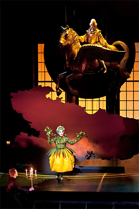 Tous ces aspects sont restitués avec bonheur à l'Opéra Comique dans la mise en scène de Jonathan Kent. Le cabinet de curiosités qui garnit les côtés de la scène nous emmène d'emblée à la fin du XVIIème siècle. Le duc, Egée et les jeunes gens bénéficient de costumes chatoyants et précieux, tirés tout droit de la même époque. Leur succède une équipe de nettoyeurs en tenues de service contemporaines, munis des agrès réglementaires (seaux, balais, serpillières...) qui va s'essayer à monter Pyrame et Thisbé ! Soulignons au passage la force comique du duo que constitue Desmond Barrit, Pyrame bouffi d'orgueil cabotin, avec un Robert Burt irrésistible dans son travestissement en Thisbé, lors de leur pittoresque et laborieux montage du pastiche d'Ovide. Le même Barrit, affublé d'une paire de baskets en guise d'oreilles d'âne, nous offre de savoureux moments lorsque Titania le poursuit de ses faveurs ! Dans la même veine, mais cette fois en musique, le duo de Mopsa et Corydon au masque du troisième acte (Robert Burt, encore une fois travesti, et Andrew Foster-Williams) est un morceau d'anthologie burlesque, qui éclate dans l'irruption finale d'une flopée de petits lapins, irrésistibles bunnies se livrant sur scène à des simulacres d'accouplement ! Les machineries ne sont pas oubliées. Pour ne citer que les passages les plus marquants, c'est sur un Pégase tombé des cintres qu'Andrew Davies (Phoebus) chante son air au masque du quatrième acte. Et Lucy Crowe est une éblouissante Junon suspendue dans le vide au masque du cinquième acte. Les pantomimes sont de grande qualité, en particulier celles des fées au premier masque, et celles du troisième masque. S'y ajoute le mélange délicat du chant et de la danse lors du défilé des saisons au masque du quatrième acte, avec notamment un émouvant Eté orné de fruits de Sean Clayton, et un saisissant Hiver décharné de Foster-Williams. Et la musique, et le chant dans tout cela ? La direction fluide et énergique de William Christie à la tête des Arts Florissants fait merveille pour enchaîner imperceptiblement les tableaux les plus variés, passant avec aisance des solistes aux chœurs et vice-versa. Les cuivres sonnent richement, les cordes sont onctueusement grainées ; le solo de flûte à bec du second masque (dans l'air du ténor) brillant et sans faille. Au plan vocal, la distribution est largement dominée par le trio Crowe-Debono-Foster Williams. La première nous enchante régulièrement de son timbre velouté à la projection généreuse, la seconde de sa voix cuivrée à chacune de ses apparitions plus rares. Quant à Foster-Williams, c'est un petit triomphe personnel qu'il s'offre dans ses nombreux rôles, emplis de sa voix chaleureuse et portante de basse. Face à ce trio de haute volée, Emmanuelle de Negri fait preuve d'une bonne technique mais manque un peu de projection. La seule véritable déception vient du ténor Ed Lyon : dès son premier air ("Come all ye songsters" au masque du deuxième acte) la projection s'avère notoirement insuffisante, et le timbre manque cruellement de stabilité. Retenons toutefois à son crédit un bon jeu théâtral, en particulier dans le rôle d'Adam au cinquième masque. Soulignons aussi la pléiade de seconds rôles de qualité, et notamment parmi eux : Robert Burt, ténor aussi à l'aise dans le chant (Mopsa) qu'au théâtre (Flute), Sean Clayton, touchant Eté cité plus haut, David Webb en Automne chaleureux, et les trois fées (Miriam Allan, Anna Devin, Maud Gnidzaz). Enfin, pour la partie proprement théâtrale, et bien que nous ne soyons pas spécialiste en ce domaine, il faut citer William Gaunt, Duc à la majesté empreinte de détachement ironique, et Jotham Annan, Puck habité d'une rouerie complice et sensuelle. En résumé, voici un spectacle incontournable pour tout baroqueux soucieux d'avoir une juste idée du semi-opéra anglais. Et pour ceux qui n'auront pas eu le plaisir d'assister aux représentations, espérons que l'Opéra-Comique, dans le cadre de sa politique de diffusion qui nous a donné livraison il y a quelques semaines du Didon et Enée de la saison passée, en proposera bientôt l'enregistrement en DVD !