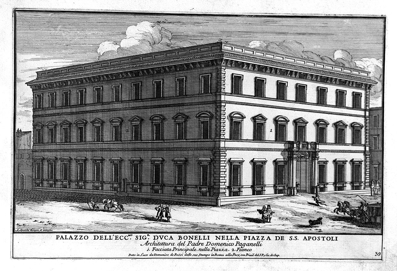 Vue du Palazzo Bonelli, gravure de Giovan Battista Falda (dessin) et Alessandro Specchi (graveur), état du bâtiment vers 1650 – Catalogo del Beni Culturali, licence Standard (BCS)