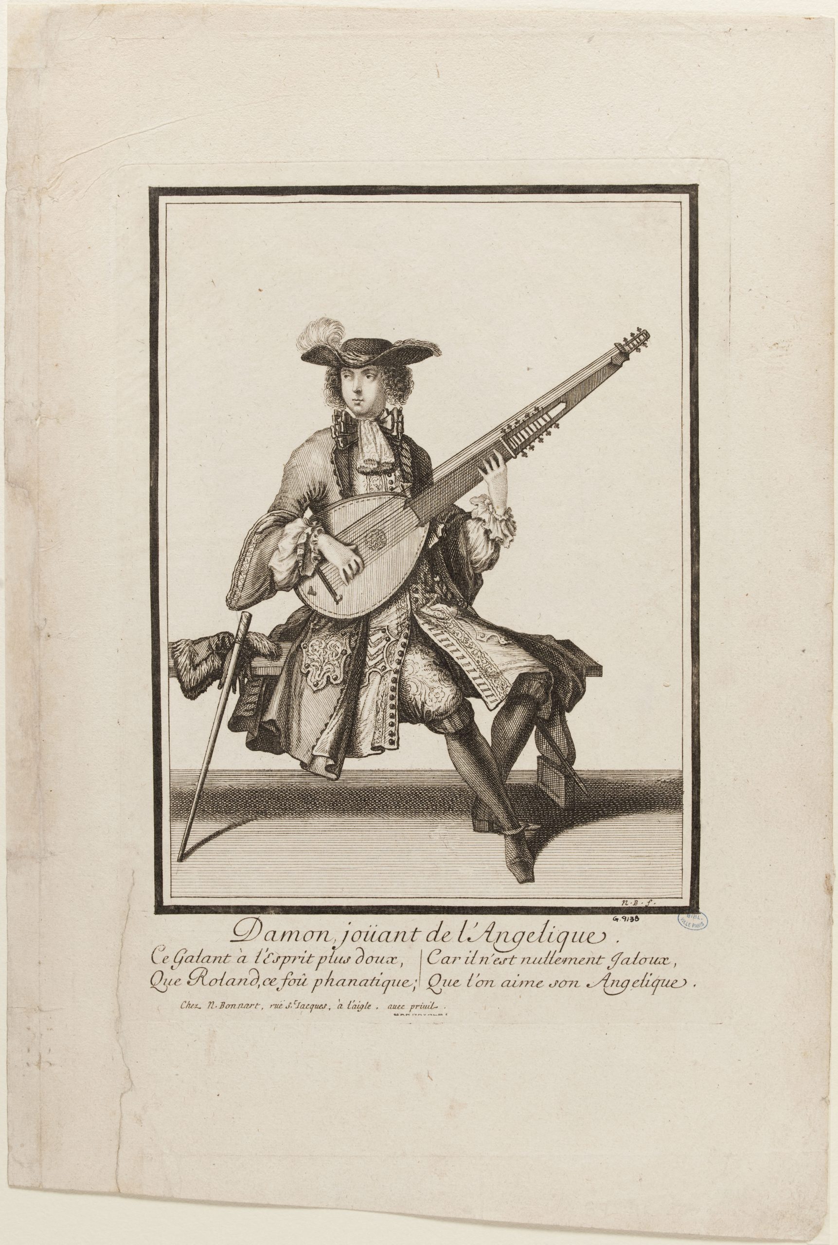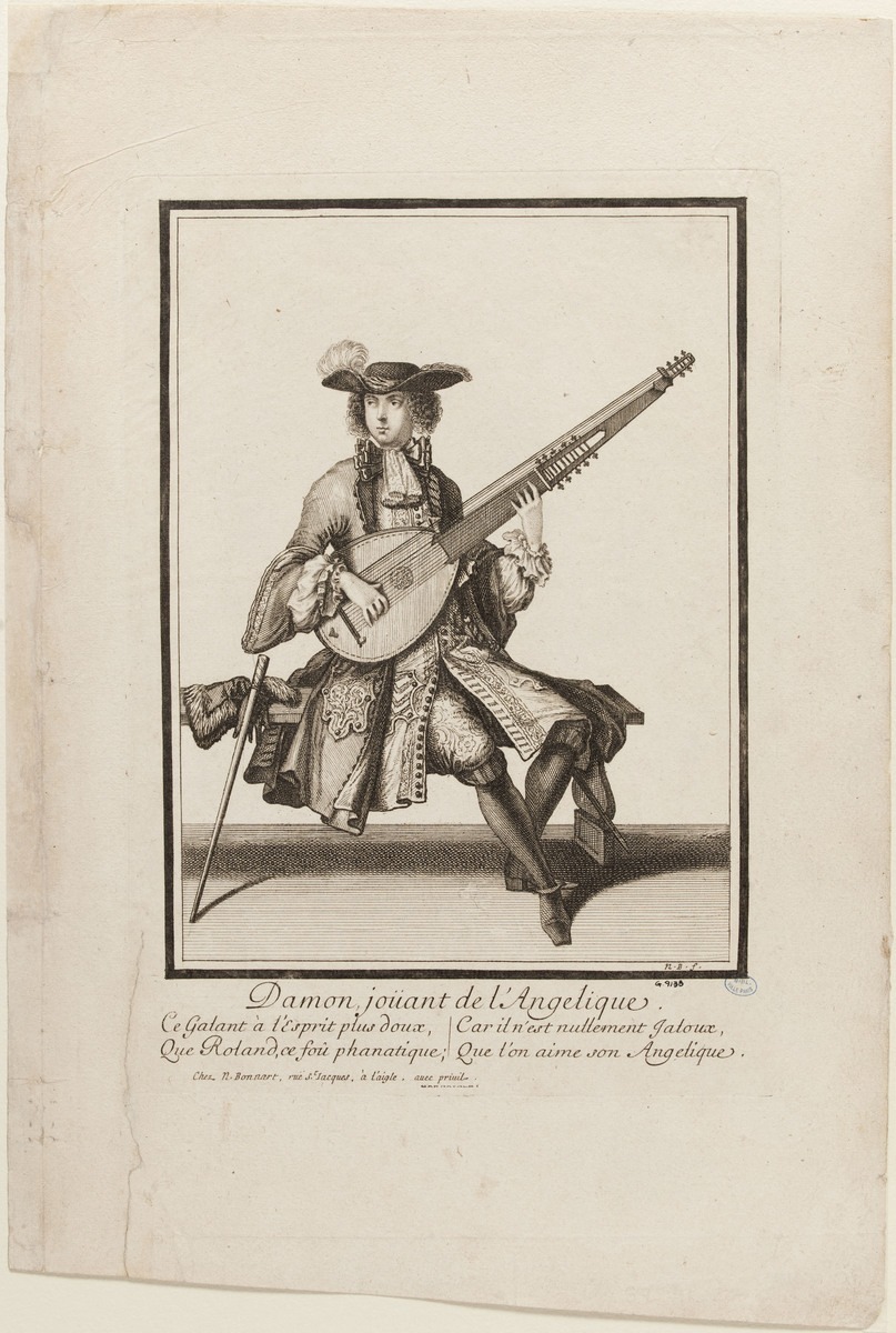 Nicolas Bonnart (1646-1918). “Damon jouant de l’Angélique”. Eau-forte. Paris, musée Carnavalet.