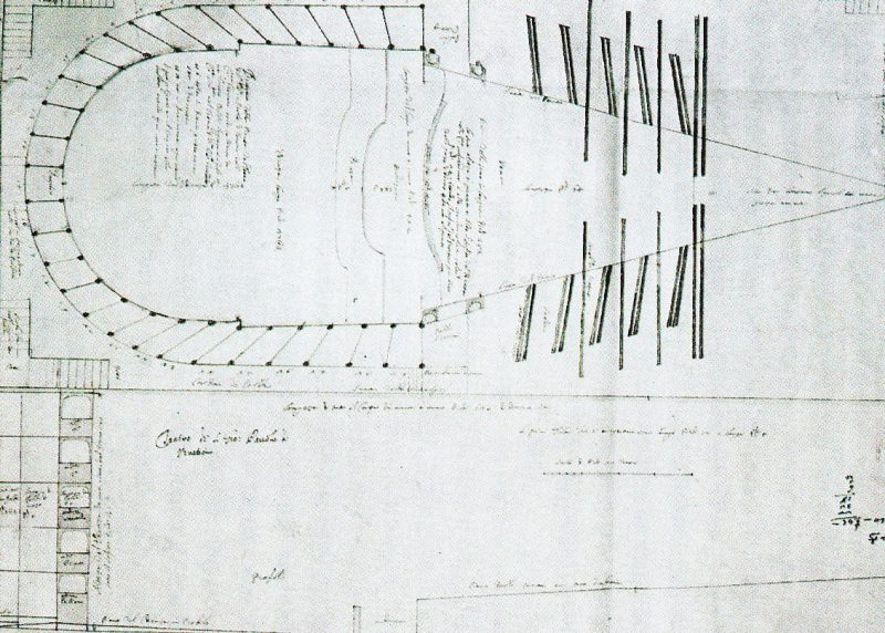 Plan de salle du Teatro Grimano en 1654 dessiné par Carlo Fontana, dessin conservé au Sir Joah Soane’s Museum de Londres – Source : Wikimedia Commons