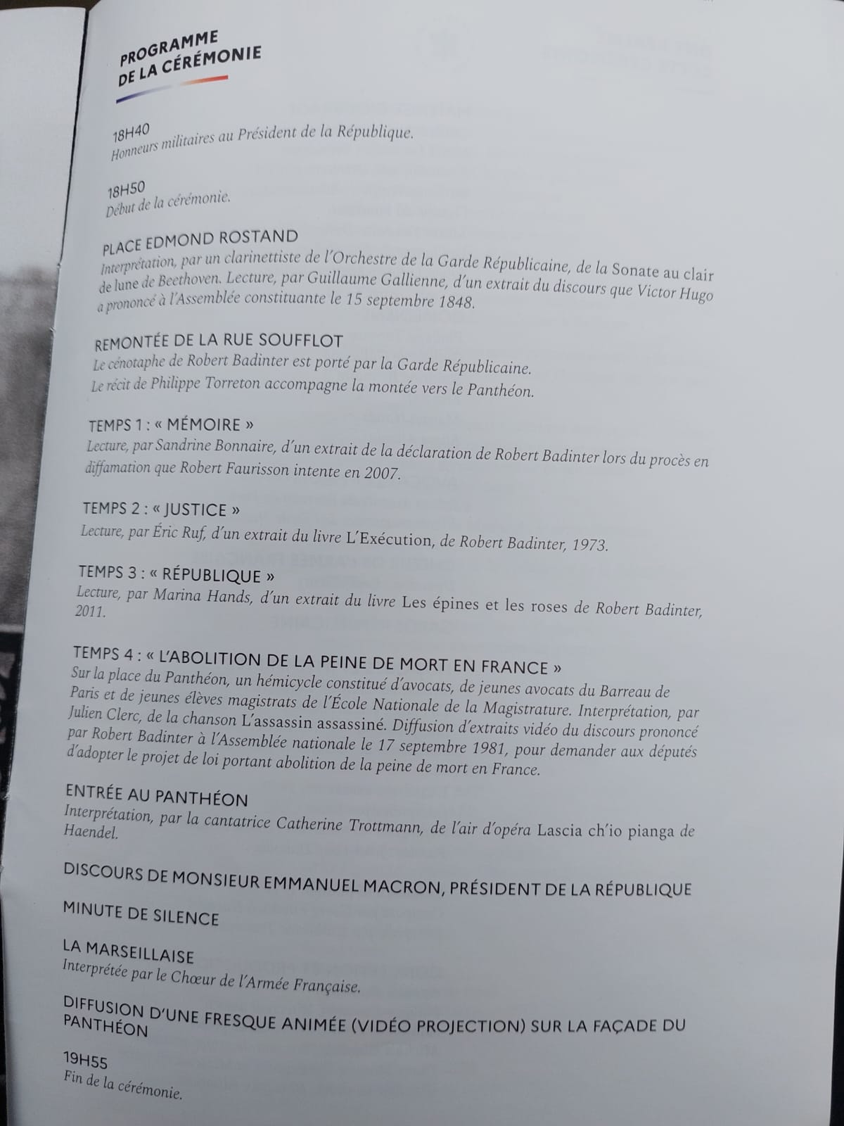Programme de la cérémonie de panthéonisation de Robert Badinter © Muse Baroque, 2025