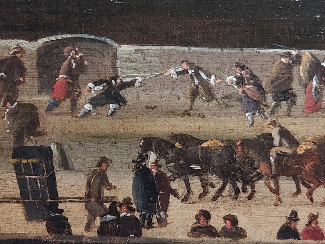 Duellistes. Anonyme (vers 1665), Le Pont Neuf vu de l’entrée de la place Dauphine, huile sur toile, Musée Carnavalet (détail) © Muse Baroque, à l’occasion de l’exposition Duels, l’art du combat, d’avril à août 2024 au Musée de l’Armée.