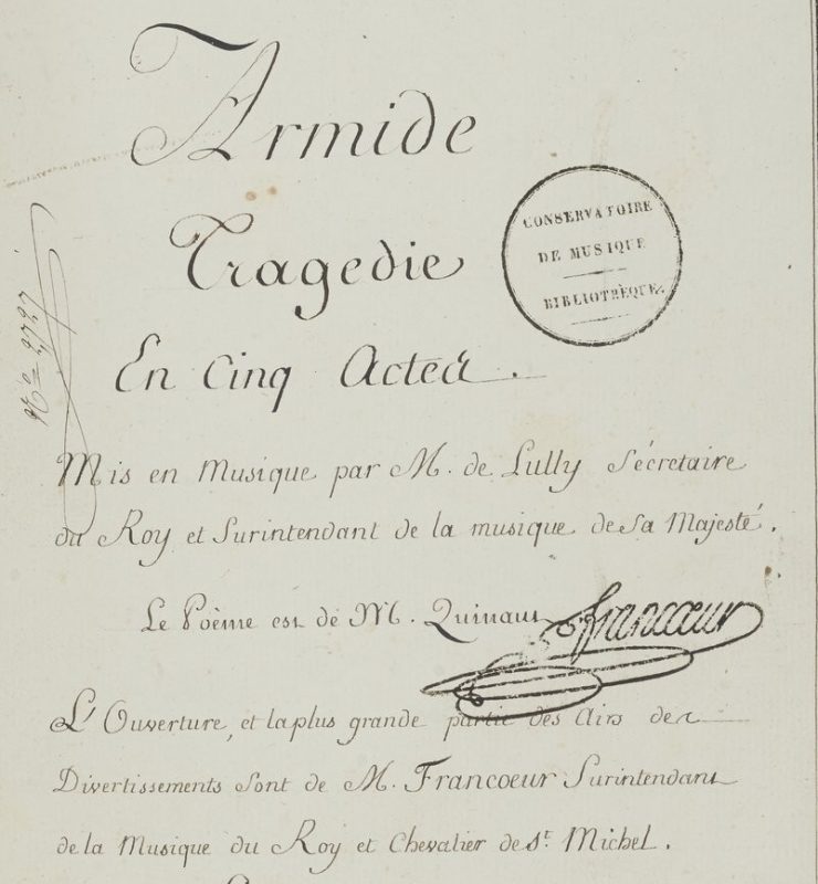 Partition manuscrite (détail) Armide // Tragedie // En Cinq Actes. // Mis en Musique par M. de Lully Secrétaire // du Roy et Surintendant de la musique de sa Majesté. // Le Poème est de M. Quinaut // L’Ouverture, et la plus grande partie des Airs des Divertissements sont de M. Francoeur Surintendant // de la Musique du Roy et Chevalier de St. Michel. // Edition derniere. // 1781 – Source : Gallica / BnF