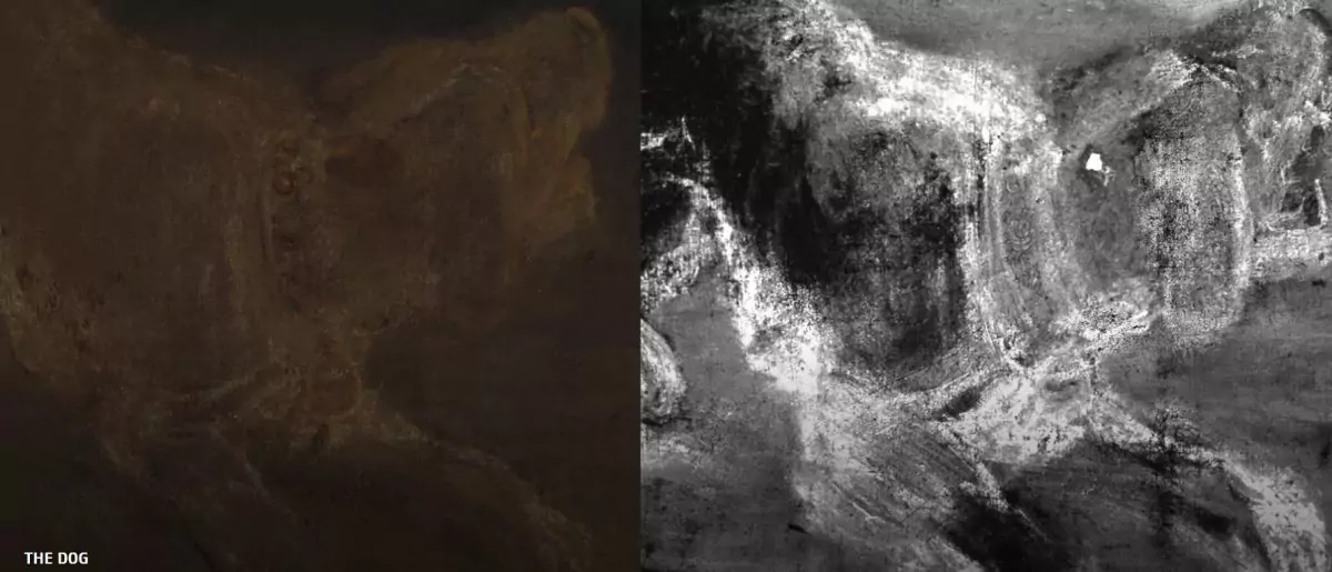La nouvelle qui vient d’être dévoilée est à al fois anecdotique et majeure dans la compréhension de la technique picturale du Maître. Comme les amateurs le savent, une vague silhouette canine blanchâtre, à demi effacée, hante l’angle gauche du tableau. Les analyses ont démontré que cette apparence provenait d’une esquisse riche en craie, posée par Rembrandt en couche préparatoire. Ce procédé, inédit chez le lui à ce jour, à notre connaissance, servait à définir rapidement volumes et contours, en laissant le brun du support transparaître. Mais les siècles et les restaurations ont fragilisé ces zones et l’esquisse crayeuse, usée et abrasée, a refait surface, déséquilibrant les harmonies colorées. Le chien s’est donc transformé en fantôme.
