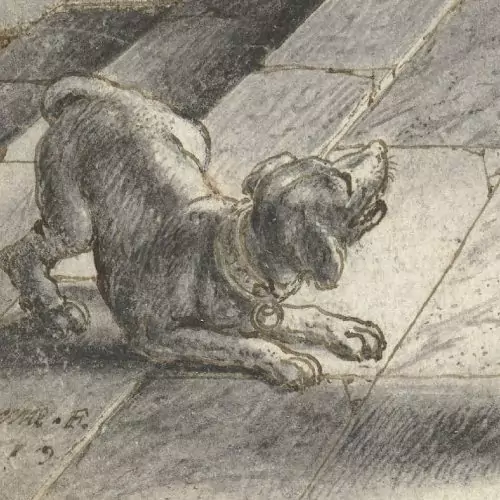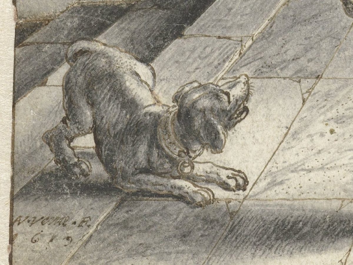 En outre, deuxième coup de théâtre, l’historienne de l’art Anne Lenders a débusqué un dessin d’Adriaen van de Venne (vers 1619) représentant un chien dans une pose étrangement similaire : tête inclinée, gueule entrouverte, collier à anneau, il figurait sur un livre, tandis que la feuille originale est conservée au Rijkmuseum et représentent Joseph en pied (pour un frontispice lié à l’épisode biblique où la femme de Potiphar, officier du Pharaon s’éprend de Joseph qui refuse ses avances. Elle l’accuse alors d’avoir voulu la violer et le fait jeter en prison).