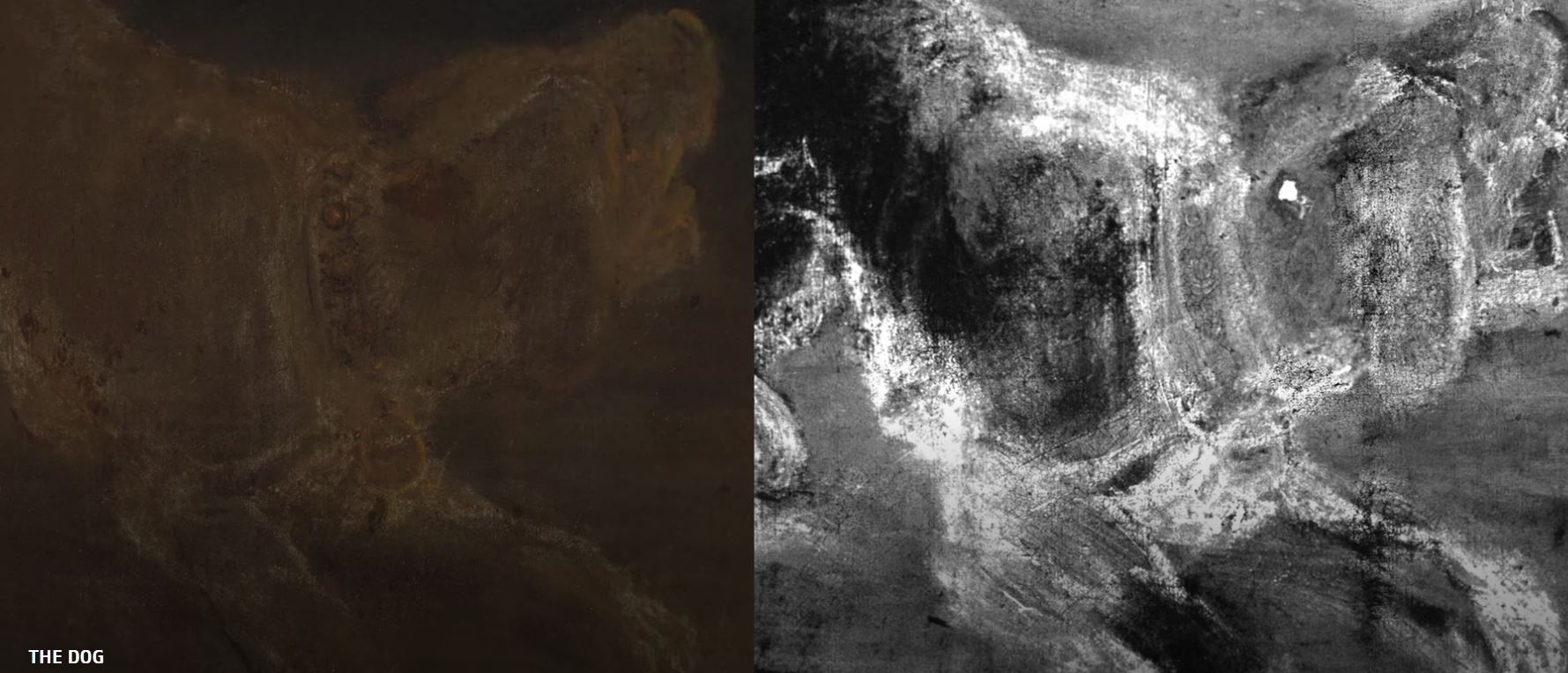 Le chien de la Ronde de Nuit de Rembrandt : à gauche gros plan du tableau, à droite cliché Rayon X (détail) © Rijkmuseum Amsterdam