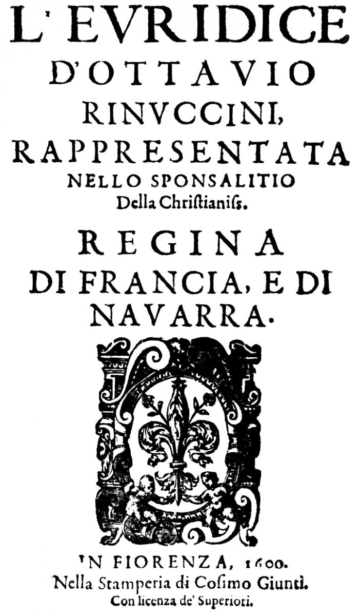 Page de titre du livret de l’Euridice de Peri (1600) conservé à la München, Bayerische Staatsbibliothek — Res/L.eleg.m. 3751. Source : Wikimedia Commons