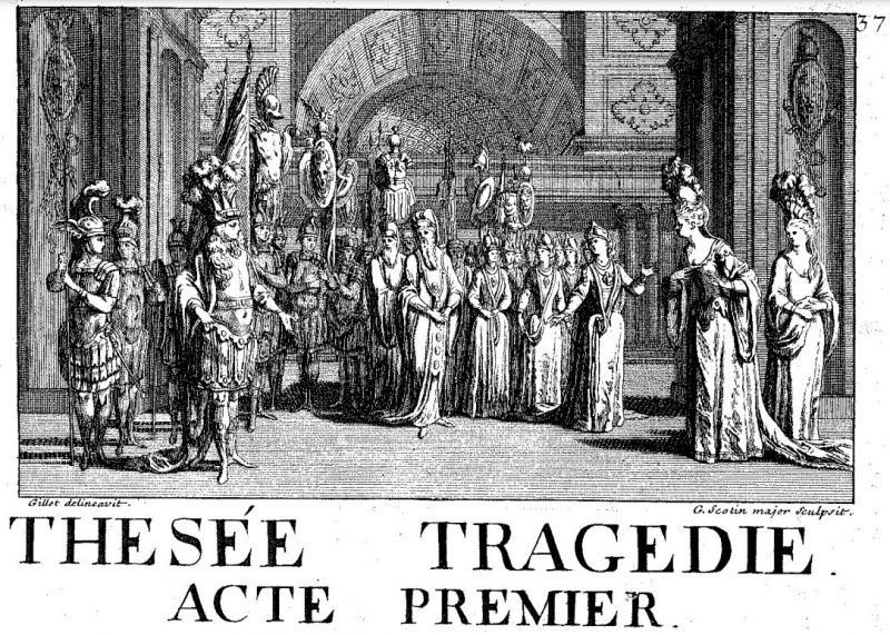 Gravure en frontispice de l’acte I de la partition de Thésée gravée par H. de Baussen (Paris, 1711)