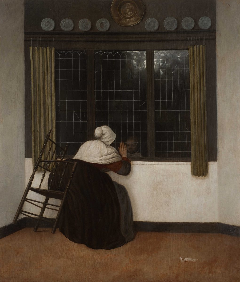 Jacobus Vrel, Femme saluant un enfant à la fenêtreHuile sur bois. – 45,7 × 39,2 cm, Paris, Fondation Custodia, Collection Frits Lugt, inv. 174