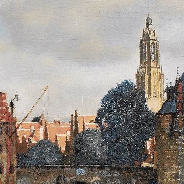 Johannes Vermeer, Vue de Delft (détail de la Niewe Kerk), huile sur toile, 96,5 × 115,7cm, vers 1659 – 1663, conservée au Mauritshuis de La Haye – Source : Wikimedia Commons