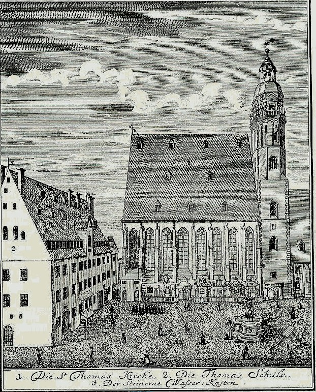 Schule zu S. Thomae, 1723. On sait que Bach composa plusieurs cycles de cantates sacrées pour Leipzig. Plus de 200 oeuvres sur 300 environ nous sont parvenues. En tant que Cantor, Bach devait veiller à l'execution hebdomadaire de musique sacrée dans les églises de la ville. A Saint Thomas et à Saint Nicholas, l'on jouait de la musique figurée, c'est-à-dire de la musique d'ensemble concertante. L'église Neuve se contentait de motets et chorals tandis que Saint Pierre n'avait que ces derniers. A Saint Thomas et Saint Nicholas, quand étaient jouées les cantates de Bach ? La réponse apparaît au dos de la copie du BWV 61 "Nun komm, den Heiden Heiland" composé à Weimar vers 1714 mais redonné à Leipzig. Ces quelques lignes retracent le déroulement du service religieux de Noel. Nous en donnons le texte ci-après tel qu'il est cité par W. Sandberger dans son Bach 2000, vingt-quatre inventions sur Johann Sebastian Bach, J.B. Metzler Verlag, 1999. Les mots en latin et les majuscules le sont dans le document original.