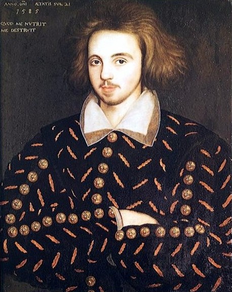 Portrait présumé de Christopher Marlowe daté de 1585 sur lequel figure la devise "Quod me nutrit me destruit" (ce qui me nourrit me détruit) © Wikimedia Commons