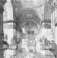 D.R. Gravure du XVIIème montrant le chœur et les tribunes Le compositeur obtient ainsi des effets saisissants, tout en limitant l'inconvénient lié au fort effet d'écho qui risque rapidement de brouiller les parties.