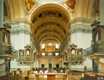 Cette messe monumentale va nous permettre de comprendre comment les compositeurs créaient leurs œuvres en tenant compte de l'acoustique particulière du lieu où elles allaient être jouées. En effet, la Missa Salisburgensis sert avant tout de marque de puissance du prince, rythmant la vie publique. Ce type d'oeuvres sacrées ou profanes, commandées à des artistes en vogue, faisaient appel à des effectifs impressionnants, sans compter les frais titanesques engendrés par la décoration, les gardes, les feux d'artifice, etc... La musicologue Patricia Ranum a montré qu'à l'occasion du Te Deum de Charpentier joué le 8 Février 1687, la musique constituait moins du quart du budget dépensé. Elle montre aussi que le cachet du compositeur/chef d'orchestre/interprète était finalement assez faible puisqu'il devait payer avec la somme qu'on lui allouait le salaire des instrumentistes et chanteurs. La Missa Salisburgensis La Missa Salisburgensis de Heinrich Franz Ignaz von Biber fut probablement conçue pour la célébration en 1682 du onzième centenaire de la fondation de l'archevêché de Salzburg. Le Prince-Archevêque demanda alors à Biber* d'écrire une œuvre fastueuse et rutilante; ce qu'il fit au-delà de toute espérance : 54 voix, 16 vocales et 35 instrumentales, divisés en 5 " coro " et 2 " loco ".Violons, violes, flûtes, hautbois, cornets à bouquins, clarini, trompettes, trombes, trombones, timbales et orgue sont requis. La cathédrale de Salzburg fut construite par Santino Solari. Le splendide édifice fut terminé en 1628. Sans s'attarder sur sa remarquable architecture, il est utile de noter la très forte réverbération due notamment à la coupole et les quatre tribunes pourvues d'orgues qui se situent à la croisée de la nef et du transept (cf. infra).