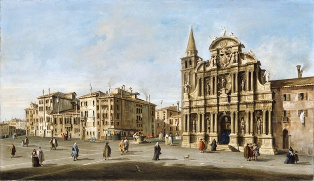 Francesco Guardi, Place Santa Maria del Giglio, huile sur toile, 50 x 84 cm, Collection privée - © DR Né dans une famille de peintres, le jeune Antonio Canal (1697 - 1768) débute sa carrière vers 1716 - 1720, aux côtés de son père, en peignant des décors de théâtre (en particulier pour deux opéras d'Alessandro Scarlatti : Tito Sempronio Gracco et Turno Arecio, représentés durant le carnaval de 1720). Dès 1722 il s'oriente résolument vers la création de toiles adaptées à la demande des visiteurs étrangers, et en particulier anglais, sur la commande du consul britannique John Smith. Le format des toiles s'adapte à cette demande particulière : les toiles de grande dimensions des débuts cèdent progressivement le pas à des tableaux de plus petit format, plus facilement transportables...Et les compositions sont également élaborées en fonction de la demande : mise en scène des monuments à l'aide de perspectives théâtrales, de points de vue imaginaires parfois en décalage avec la réalité visuelle (comme la représentation conjointe de monuments qui ne peuvent être observés depuis un même point de vue). Le succès ira grandissant tout au long de la carrière de l'artiste : Joseph Smith (qui succède à John Smith en tant que consul britannique auprès de la Sérinissime) acquiert de grandes quantités de toiles (qu'il revendra en 1762 à son monarque, origine de l'impressionnant fonds de Canaletto des collections privées de la Couronne britannique), Canaletto se rendra même en Angleterre en 1746 pour savourer pleinement son succès. Quelques décennies après sa mort, dans un XIXème siècle pourtant prompt à répudier le baroque du siècle précédent, ses toiles sont très recherchées, atteignant des cotes élevées. Elles rejoignent progressivement les musées.