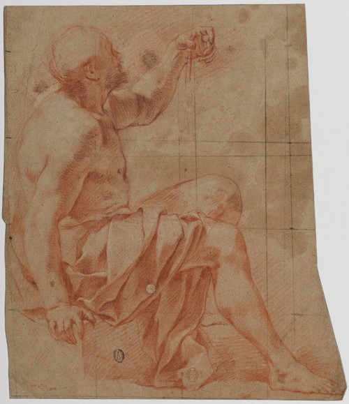 15- Charles Le Brun (1619-1690), Homme assis tourné vers la droite, la main gauche en appui sur un bâton. Sanguine avec rehauts de craie blanche. Mis au carreau à la pierre noire © BnF, département des Estampes et de la photographie Enfin, l'influence de Le Brun est perceptible chez les jeunes peintres qui collaborent avec lui sur les chantiers royaux du règne de Louis XIV, notamment Charles de la Fosse (1636-1716) et Jean Jouvenet (1644-1717) dont sont exposées ici des études pour de grands travaux aujourd'hui conservés au Louvre. Leur intérêt pour la couleur et l'apport des exemples vénitiens et flamands annonce déjà les débuts d'une autre époque.