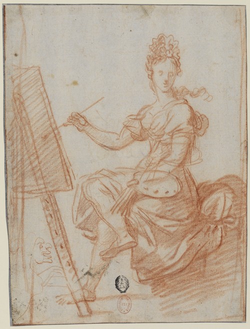 22- Robert Bonnart (1652-1733), La Peinture. Sanguine © BnF, département des Estampes et de la photographie Comment parler du règne de Louis XIV sans évoquer son premier peintre ? Une section entière de l'exposition est consacrée à Charles Le Brun, mettant en lumière des travaux préparatoires méconnus. Parmi un ensemble de dix-sept dessins, on découvre ainsi les débuts du peintre, notamment à travers des travaux de jeunesse destinés à la gravure datant des années 1640 : L'Espoir de la France et L'Oblation du dauphin. Plusieurs études à la sanguine révèlent la dextérité de Le Brun dans ce médium, qui reprend à sa manière les leçons de Simon Vouet.