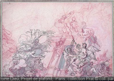 1. Jean Nocret, Projet de plafond. Etude pour la chambre à coucher de la reine aux Tuileries ? Graphite, sanguine. H. 475, l. 405mm. Paris, Musée des Arts Décoratifs, Inv. 2170 © Les Arts décoratifs / Jean Tholance, tous droits réservés Sous l'influence des peintures d'Annibal Carrache (1560-1609) pour la galerie Farnèse à Rome, le plafond parisien évolue à partir des années 1640 : devenant plus complexe par la compartimentation de l'espace et l'articulation entre les différents registres, le plafond "à l'italienne" présente des surfaces peintes plus vastes qui laissent aux peintres la possibilité de laisser libre cours à leur imagination. Les plafonds qui s'ouvrent vers le ciel laissent la part belle aux figures allégoriques et aux angelots virevoltants. Ainsi, devant leur feuille de papier, certains artistes, comme Antoine Dieu (vers 1662-1727), se projettent vers le décor final, envisageant l'impressionnant effet de contre-plongée.