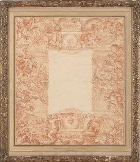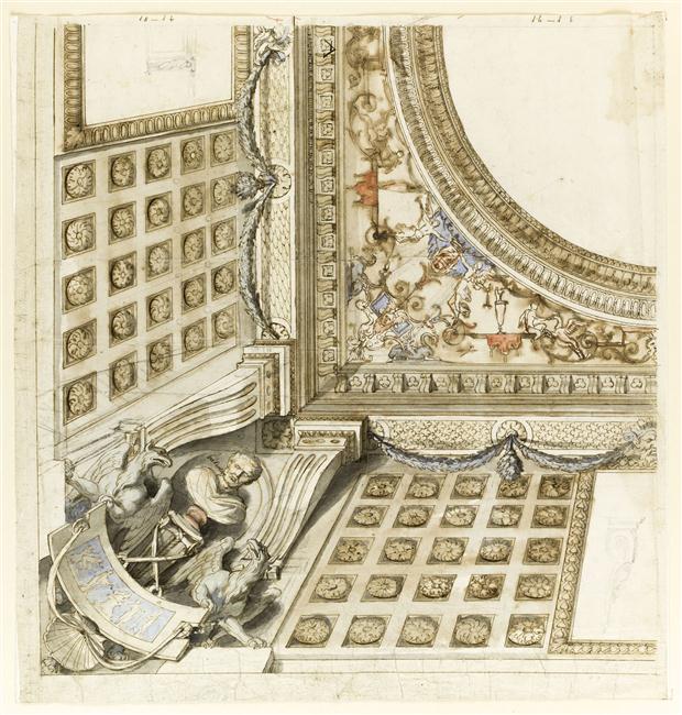 2. Antoine Dieu, Projet de plafond. Sanguine, plume et encre grise, lavis gris. H. 243, l. 355mm. Paris, collection Part © coll. part. Les dessins distinguent souvent les parties principales des parties secondaires, ornementales, des plafonds décoratifs, suggérant une répartition des tâches entre peintres et décorateurs ou une réalisation en deux temps. Certains feuilles proposent plusieurs alternatives à un même projet, laissant un choix au commanditaire. Pour ce qui est du vocabulaire ornemental, les artistes peuvent s'appuyer sur des traités de perspectives et recueils gravés dont la diffusion fait également le bonheur des collectionneurs de l'époque.