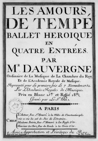 Les Amours de Tempé, ballet héroïque en quatre entrées représenté pour la première fois le 7 novembre 1752 par l'Académie royale de musique. Gravé par le Sr Hüe -l'auteur (Paris)-1753 © BNF / Gallica