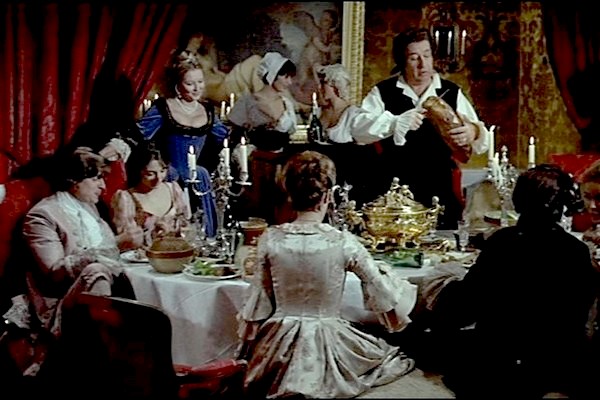 L'Abbé Dubois (Jean Rochefort) D.R. Une comédie antique, une pièce de théâtre dans laquelle les interprètes ne sont que des marionnettes aux ficelles tenues par des puissance joueuses et cruelles... Presque d’emblée, cette thématique sous-jacente est posée : le Régent apparaît dans le reflet d’un miroir, reposant sur un lit entouré de candélabres, décor singeant une couche mortuaire sur laquelle repose un semi-ectoplasme (semi car ne menant une vie de fantoche qu’à la nuit tombée) dont l’une des filles vient de crever (terme dur mais approprié) d’un excès de nourriture et d’alcool. On joue un rôle le jour, à la Cour, avec les ministres, face aux cousins et courtisans, devant une pléiade de personnages aux intérêts divers, chacun centré sur ses propres ambitions. On endosse un costume différent le soir, dans les bordels de luxe ou dans de petites maisons de banlieue. Très shakespearien... Mais tandis que les uns, en tout petit nombre, jouent, intriguent et se travestissent dans un univers doré, d’autres se débattent et affrontent une réalité très rude. La juxtaposition est d’ailleurs intéressante. Les appartements du petit roi, ceux du Régent ; les hôtels particuliers et les maisons closes, tous ces décors rutilent de meubles précieux de bois exotiques, de vaisselle d’argent, de tableaux de maître, de textiles somptueux... mais sont envahis de rats et de vermine, comme une gangrène inéluctable qui rognerait les choses et les êtres. A l’inverse, le château de Pontcallec, entre terre âpre et mer sauvage, évoque un univers certes misérable, dénudé, démuni, mais peut-être plus sain. Les roués du Régent meurent d’engorgement, après des orgies de nourriture et de sexe ; les paysans de Pontcallec, au contraire, meurent de faim...