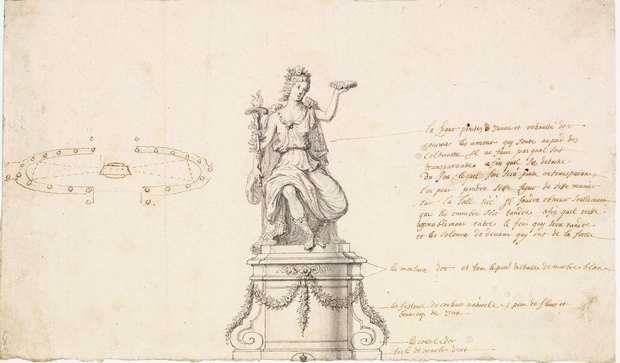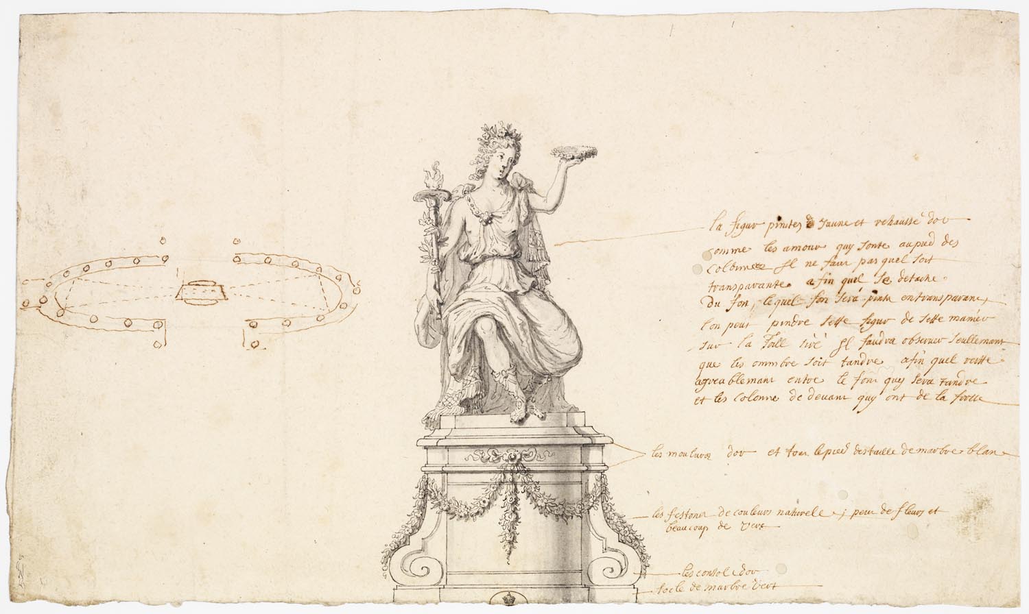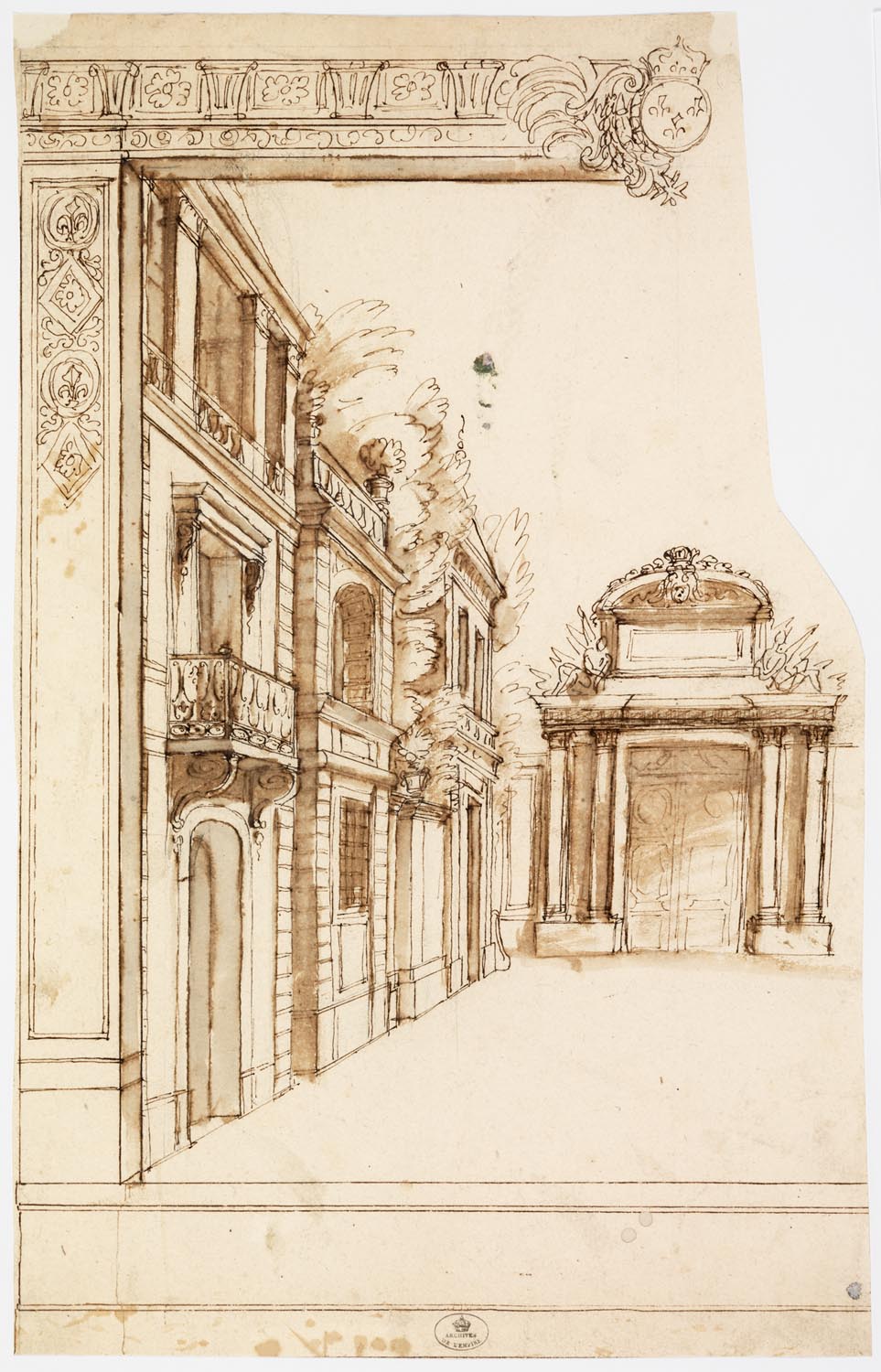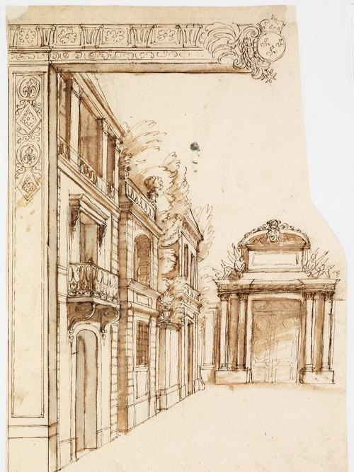 1. L'organisation de l'exposition Muse Baroque : Comment vous est venue l'idée de monter cette exposition ? P. Jugie : Comme pour la plupart des nombreuses expositions offertes au public par les Archives nationales, celle-ci a été conçue pour mettre en valeur les principales découvertes faites lors de l’élaboration d’un inventaire scientifique, en l’occurrence celui des 866 œuvres d’art graphique contenues dans les Recueils des Menus Plaisirs du roi (conservés dans les archives des Menus Plaisirs, formant une partie du fonds de la Maison du roi). Cet inventaire est, quant à lui, désormais accessible sur le site Internet des Archives nationales, sous forme d’une base de données ("Menus Plaisirs du roi") dotée d’images numériques de haute qualité. J. de la Gorce : Cette exposition est le couronnement d'un patient travail d'identification. En effet les planches du fonds ont été collées sans ordre ni logique dans les recueils, sans légende, ni auteur, ni date. Et pendant longtemps les historiens du théâtre ont été des littéraires, qui privilégiaient le texte par rapport au décor des représentations, ce qui explique le relatif oubli de ce fonds. Pourtant Torelli, arrivé en France sous le ministère de Mazarin après une carrière vénitienne, à la demande d'Anne d'Autriche, a complètement révolutionné les techniques de la représentation théâtrale, en introduisant les changements de décor à vue, prouesse incroyable pour l'époque ! C'est donc à Torelli que l'on doit l'introduction de la mise en scène de l'opéra italien au sein de la tradition française du ballet de cour (scène infernale du Ballet de Psyché dansé en 1656 par le jeune Louis XIV - cf. infra). Le spectacle baroque était un spectacle sans interruption ; des pièces instrumentales qualifiées d'entractes étaient jouées pendant les changements de décor, afin de couvrir le bruit de la machinerie. Dans ce contexte, le merveilleux est à la fois céleste et infernal. Tous deux ont d'ailleurs des liens étroits avec le pouvoir politique, commanditaire de ces représentations. Servandoni a poursuivi cette tradition, en la développant. On importait un art d'Italie, en l’acclimatant à la tradition du grand théâtre français... CAT n°56. Projet de Jean Berain pour le décor de la troisième entrée de l'Europe Galante (musique de Campra, livret d'Antoine Houdar de la Motte), opéra-ballet créé à Paris le 24 octobre 1697. Dessin à la plume, à l'encre brune et au lavis brun, avec des traces de pierre noire. © Archives Nationales M. B. : Comment avez-vous procédé pour la difficile sélection des œuvres ? J.D.L.G. : Monter une exposition, c'est comme créer un spectacle... Sur 866 documents du fonds, il a fallu sélectionner 110 pièces, auxquelles se sont ajoutées une vingtaine de prêts (dont les maquettes d’Algieri, du milieu du XVIIIe siècle, conservées à Champs-sur-Marne). Les principaux critères de ce choix ont été : la volonté de réunir des originaux de qualité (mêmes si les projets n'ont pas tous été réalisés), la typologie des projets (elle coulait de source...), la volonté de privilégier les inédits. Ce travail a pris plus de trois ans, la seule élaboration du catalogue plus d’une année. P. J. : Jérôme de La Gorce a aussi insisté pour que les œuvres révélant des options différentes, soient privilégiées. Cela peut se traduire par des projets proposant à droite une solution différente de celle de gauche, ou encore l'utilisation de retombes (morceaux de papier ou de carton que l’on peut ouvrir ou fermer). M. B. : La scénographie a-t-elle posé des problèmes particuliers ? P.J. : La scénographie est extrêmement importante pour une exposition comme celle-ci, et nous pensons que Delphine Lebovici et Martin Michel ont remarquablement joué sur l'éclairage afin de mettre en valeur chacune des œuvres. Je me souviens autrefois d'expositions au Louvre même où les dessins paraissaient très pâles, presque ternes. Ici nous avons réussi – je l'espère – à évoquer les châssis des théâtres à l'aide d'une mise en espace très sobre, qui a su intégrer la perspective sur l'enfilade des salons de la Princesse de Soubise, du XVIIIème, accessibles aussitôt après l’exposition. CAT n°21. Projet de Jean Berain pour la statue de l'Hymen dans un temple de plan circulaire, à la scène 3 de l'acte V de Marthésie, reine des Amazones (livret d'Antoine Houdar de La Motte; musique d'André Cardinal Destouches), tragédie en musique créée à Paris, le 29 novembre 1699. Dessin à la plume, à l'encre noire et au lavis gris, avec des traces de pierre noire et des annotations de l'artiste. © Archives Nationales M.B. : Pourquoi l'exposition est-elle muette, sans musique, alors que son contenu semble n'attendre que cela ? P.J. : C’est un choix délibéré. En effet, il s'agit bien d'une exposition sur les arts graphiques dans l'atelier des Menus Plaisirs, non sur les arts du spectacle à la cour de France. Comme l'évoquait Jérôme de La Gorce, nous avons ainsi également sélectionné des projets qui n'ont jamais vu le jour, car ce qui nous intéressait avant tout était la création d’œuvres sur le papier : les esquisses, les dessins. M.B. : Comment s'est fait le travail d'identification des œuvres ? P.J. : Grâce à une convention passée entre le C.N.R.S (Centre André Chastel) et les Archives nationales, le travail a été effectué dans les meilleures conditions à la section des Cartes et Plans, où sont conservés tous les volumes de la collection Levesque J.D.L.G. : Le travail d'identification est un patient jeu de détective. Il faut reconnaître les mains des artistes, exploiter la moindre annotation, analyser les copies où les décors ont été réutilisés pour plusieurs spectacles. Les caractéristiques du papier doivent également être prises en compte. Aussi, la datation du projet pour le Carrousel de la Pla