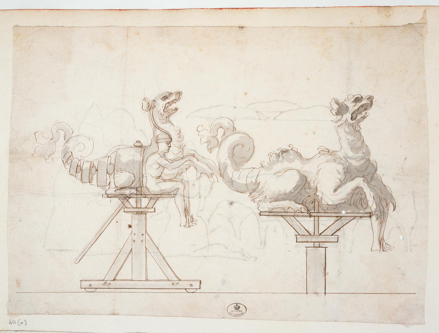 © Archives Nationales J.D.L.G. : être fabuleux, cette chimère possède une tête de lion, un corps de chèvre et une queue de dragon ! Elle a probablement été utilisée pour la reprise de l’opéra en 1705. L'intérêt du dessin est de la représenter telle qu'elle apparaissait aux spectateurs et de révéler aussi à côté comment elle pouvait être animée grâce à un machiniste dissimulé dans une carcasse d'osier… P. J. : … on sait grâce aux comptes de l’Opéra qu'il existait à Paris sous Louis XIV au moins un artisan spécialisé dans la production de ces carcasses de monstres, nommé La Varanne. J.D.L.G : De tels monstres étaient courants dans les représentations, ils faisaient partie du "merveilleux".