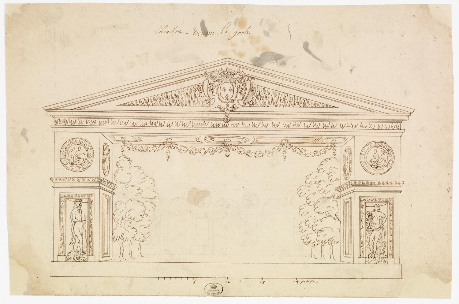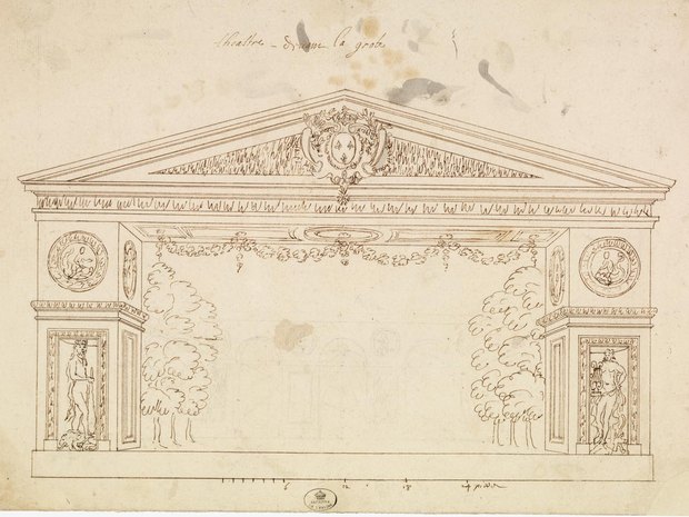 M.B : et le projet de Vigarani pour Le Malade Imaginaire ? CAT n°107. Projet de Carlo Vigarani pour le spectacle du Malade imaginaire (texte de Molière, musique de Charpentier), monté devant la Grotte de Théthis à Versailles, lors des grandes fêtes organisées en 1674 dans le parc du château pour célébrer la seconde conquête de la Franche-Comté. Dessin à la plume, à l'encre brune et à la pierre noire, avec des indications d'échelle et les annotations suivantes : "théastre devant la grote (sic)". © Archives Nationales J.D.L.G. : ce projet n'a peut-être jamais été entièrement réalisé, mais il est éloquent. Il a été conçu pour les Grandes Fêtes de Versailles de 1674, données à l'occasion de la seconde conquête de la Franche-Comté. Toute la noblesse locale de cette nouvelle province du royaume y était d'ailleurs conviée. La scène était placée devant la grotte de Thétys, aujourd'hui disparue. L'intérieur en était trop étroit et l'on construisit un décor éphémère qui utilisait la façade avec ses trois grilles dorées comme toile de fond. A l'époque, les grandes fêtes étaient ouvertes aux Parisiens. Il s'agissait donc de concevoir un décor capable d'accueillir la pièce de Molière, mort à peine un an auparavant. La musique était de Charpentier. Grâce à la gravure de Jean Le Pautre, on sait que le cadre de scène fut scrupuleusement réalisé. Vous noterez qu'il comporte des médaillons comparables à ceux qui ornaient la Grotte avec des motifs imitant des glaçons. P.J. : Les comptes des Menus Plaisirs relatifs à cette construction sont, du reste, conservés.