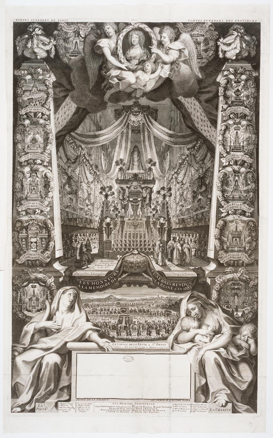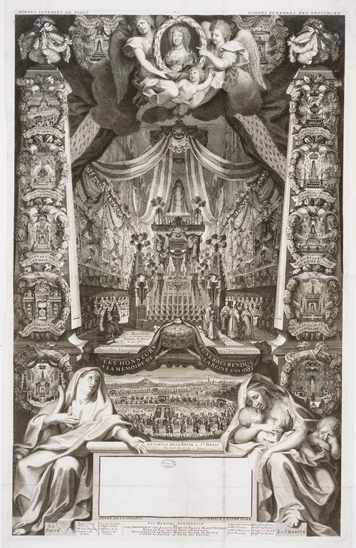 CAT n°121. Gravure anonyme pour un almanach chargée d'illustrer l'année 1683 avec au milieu de la composition une représentation de la pompe funèbre de la reine Marie-Thérèse à Notre-Dame de Paris et tout autour celles d'autres cérémonies organisées dans cette ville et en province. © Archives Nationales J.D.L.G. : on y remarque celle qui fut imaginée pour les obsèques de Marie-Thérèse à Saint-Denis. C'est à cette occasion que Lully composa son Dies Irae. Ce qui est intéressant c'est de voir comment les pompes funèbres prennent la place des monuments funéraires qui n'étaient alors plus réalisés à Saint-Denis. Les décors éphémères prennent alors le relais des sculptures pérennes, pour procurer, au milieu du XVIIIe siècle et selon le Mercure de France, de "grands et magnifiques spectacles"...