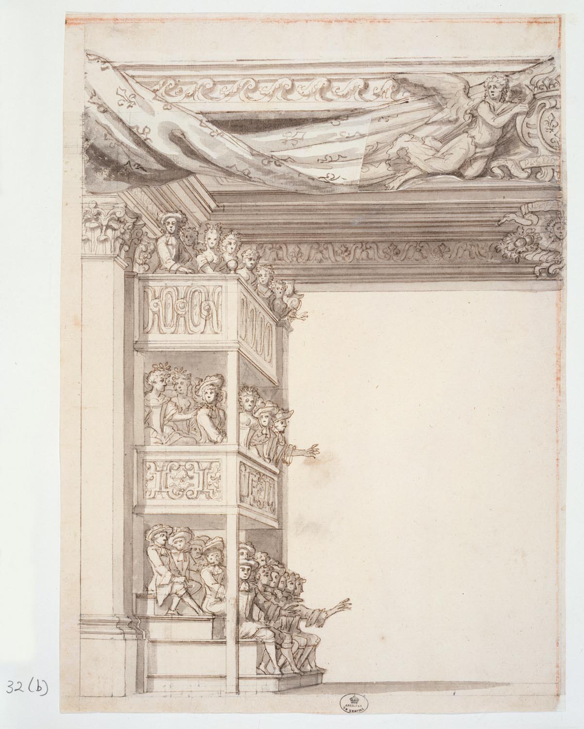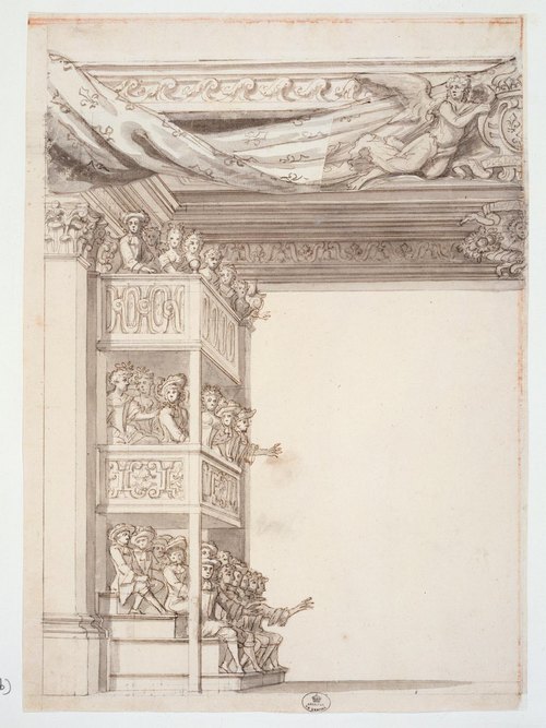 2. Morceaux choisis : quelques œuvres-phares de l’exposition librement commentées Muse Baroque : Et maintenant, parlez-nous de vos "coups de cœur... Pourquoi les loges du Palais Royal ? CAT n°37. Dessin de Pierre-Paul Sevin représentant des spectateurs installés sur trois niveaux dans des loges construites sur la scène du théâtre du Palais Royal à Paris. Une retombe (morceau de papier amovible) montre qu'au-dessus du soleil flanqué de cornes d'abondance, un rideau couvert de fleurs de lys, orné de deux génies portant les armes royales, dominait l'espace où paraissaient les artistes, et donnait plus de solennité au lieu de représentations.