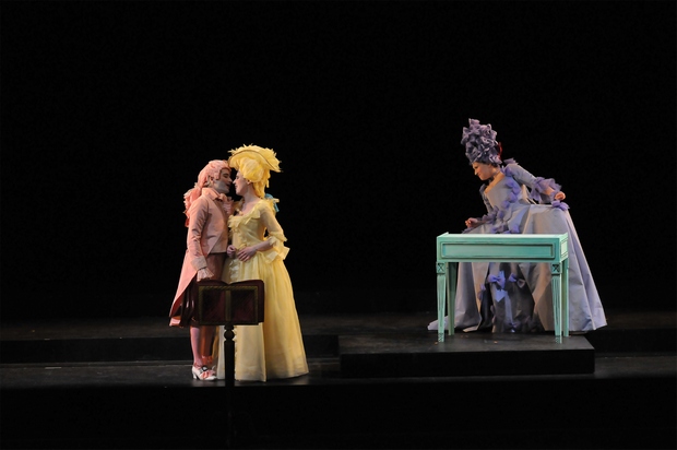 M.B. : C’est cette légèreté tourbillonnante que reflète votre mise en scène, avec ces décors en trompe l’œil aux couleurs très vives, tout comme les costumes… V.T. : Alors tant mieux ! Avec Claire Niquet (décors), Erick Plaza-Cochet (costumes) et Carlos Perez (lumière), nous avons assez longtemps tourné en rond avant de trouver le ton qui nous paraîtrait juste. En fait, tout a été élaboré en même temps : la refonte du récit, le principe des décors mobiles, celui des costumes "en papier". Ces derniers sont proches de la réalité historique, mais amplifiés, exagérés, comme le panier de Mme Saint-Clair pourtant conforme à la mode des années 1750. Lucette porte en revanche un habit de vers 1775.