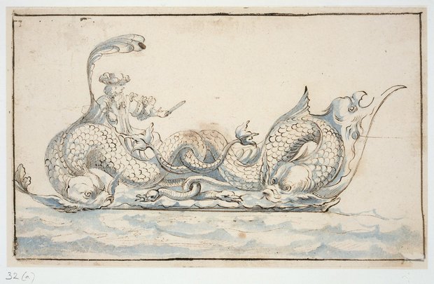 dans son char céleste, tiré par quatre chevaux. On ne pourra évidemment pas les citer toutes ici ! Commençons par les plus frappantes, celles relatives aux machines et monstres. Car si aujourd'hui les "effets spéciaux" se font avec l'appui de la technologie numérique, comment imaginer dès cette époque le recours à des machines animées, dont les effets sur les contemporains étaient au moins égaux à ceux de la musique et du chant ? A tout seigneur tout honneur, commençons par l'étonnante maquette de la scène du Palais-Royal, avec ses châssis et cabestans permettant les changements de décor à vue, les irruptions de chars célestes et l'animation des monstres sur scène...Ces Gloires, nuages, tourbillons et autres apparitions nous sont restitués à travers des dessins de Jean Bérain, pour le Canente de Collasse ou la Psyché de Lully. Défilent ensuite les chars de Mars ou d'Apollon, la chimère animée du Bellérophon, un énigmatique dragon, d'étonnants chars terrestres (tous animés) ainsi qu'un époustouflant char nautique tiré par quatre dauphins, eux-mêmes chevauchés par deux tritons incarnés par des enfants pour un épisode de Jason ou la Toison d'Or de Collasse. Une fontaine animée de Bérain nous présente comment on recréait l'illusion de l'écoulement de l'eau, grâce à l'enroulement sans fin de bandes de toile argentée sur quatre cylindres mûs par un jeune garçon placé en-dessous. Parmi les apparitions surprenantes, on notera la magnifique barque de l'arrivée du prince Carlos dans le port de Naples, décor de Berain pour Les Fêtes Galantes, ou le gracieux char entouré de monstres marins, du même pour Thétis et Pélée de Collasse, ou encore la "machine du Sommeil" dissimulée, réutilisation d'un autre opéra, qui permet d'exhumer l'Ombre d'Achille devant les Grecs et un public ébahi (Polyxène et Pyrrhus, de Collasse).