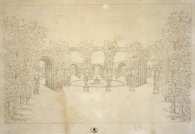 Dessin de l'atelier de Jean Berain représentant un jardin, décor de la scène 3 de l'acte I de Circé