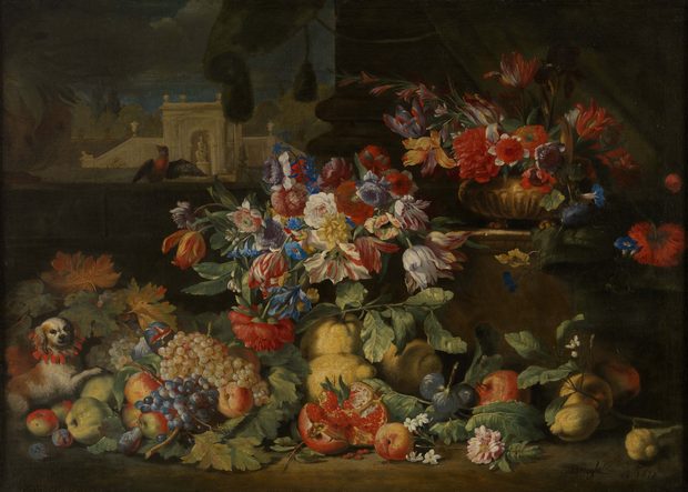 Abraham Brueghel, Fleurs et fruits © J. Geleyns_www.roscan.be Mais le génie pictural flamand de cette période ne s'est exprimé nulle part avec autant de brio que dans ses natures mortes, dont la section clôt l'exposition. Nous émeuvent ici le chardon sourdement lumineux du "Plantes et fruits avec hérisson" de Snijers, les fleurs aux coloris éclatants du "Fleurs et fruits" d'Abraham Brueghel, l'exotisme bariolé de l'oiseau scrutant de manière improbable les cristaux, argenteries et faïences de Delft dans la "Nature morte au perroquet" de van Utrecht. Toutefois c'est probablement le "Coq et dindon" de Jan Fyt qui emporte le plus fort souvenir, avec son combat de volatiles dont les couleurs nous sont parvenues si fraîches qu'ils semblent sortir de la toile !