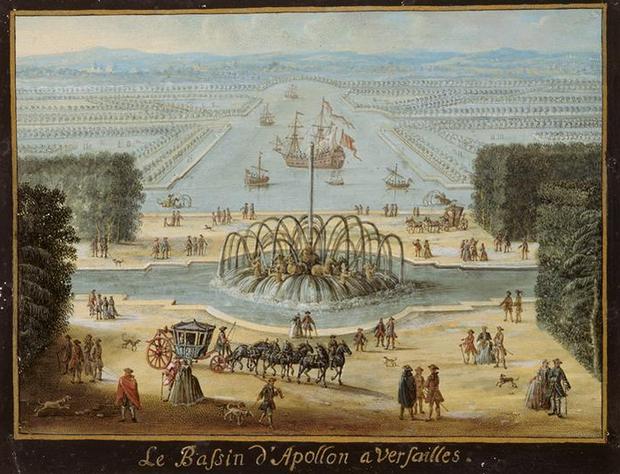 Anonyme, Vue perspective du Bassin d'Apollon et du Grand Canal avec sa flottille à Versailles (vers 1705), gouache, rehauts d'or, vélin