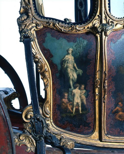 du Roi (détail), anonyme, Paris, vers 1760 L'appellation de vernis Martin vient de quatre frères, peintres-vernisseurs à Paris, qui s'étaient spécialisés dans le vernissage des décors peints (en particulier les panneaux de carrosses). Témoins de cette spécialisation, les attelages présentés dans la haute travée centrale constituent les témoignages les plus imposants de cette vogue : des chaises à porteurs élégantes qui le disputent à des traîneaux raffinés, de la majestueuse berline du roi du Portugal (circa 1760) aux panneaux soulignés de laque aventurine (incrustée de particules métalliques soufflées) à la somptueuse berline de gala (carrosse à huit glaces) en laque dorée, ces pièces sont rarement visibles. Le vernis copal (dit aussi vernis gras) était particulièrement adapté à ces usages extérieurs, puisqu'il conférait une certaine imperméabilité, à la différence de la laque traditionnelle plus sensible à l'humidité. Son pouvoir couvrant rendait les raccords du bois invisibles, offrant à l'œil de grandes surfaces étincelantes qui firent son succès entre 1710 et 1770 environ. Parmi les grandes pièces, mais cette fois d'intérieur, on retiendra les magnifiques dessus de porte et panneaux de l'hôtel du duc de Richelieu, avec des peintures en relief plus conformes à la tradition de la laque asiatique. A l'origine celle-ci était noire, ou orangée, comme en témoignent deux magnifiques chenets rocaille aux magots revêtus de costumes richement décorés. A l'occasion la laque se mêlait à la porcelaine, comme l'illustrent deux baromètres en forme de pavillon chinois (un aux fleurs en porcelaine de Vincennes, un autre aux personnages de porcelaine de Saxe).