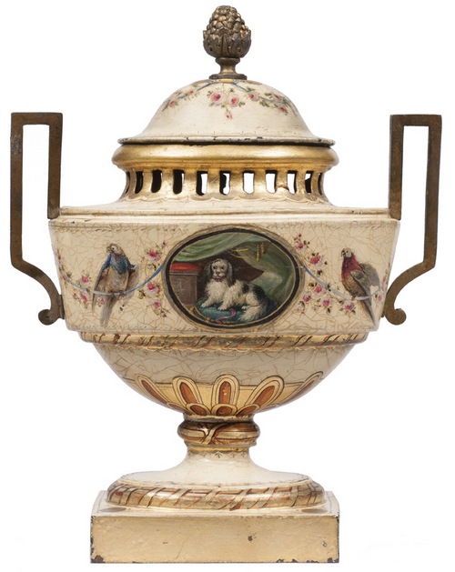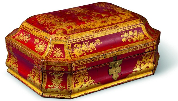 France, vers 1720 Surtout le vernis Martin appliqué à des décors peints permet de donner à de petits objets l'apparence de véritables pièces d'orfèvrerie. D'innombrables étuis, bonbonnières, boîtes à tabac ou nécessaires de toilette illustrent cette tendance, qui se maintiendra jusqu'au début du XIXème siècle : le vernis rehaussant la peinture transfigure le support de papier mâché, dont il conserve la légèreté bien commode pour la maniabilité des pièces et leur transport. Les décors suivent le goût des époques : scènes de genre et puttis de la période rocaille, scènes à l'antique et décors à bandes (grâce à l'inclusion des "paillons", miniscules pièces de cuivre pré-découpées) dans les années 1780, en passant par les rares mais somptuaires "décors à pois" d'or. L'exotisme subsiste, les décors de "chinoiseries (singes, magots) faisant place ensuite aux "turqueries". On notera tout particulièrement le flaconnier à parfums garni par l'orfèvre Villeclain (circa 1755), et l'opulente bonbonnière à la gloire de Louis XV (circa 1765). Autre application : la peinture glacée par le vernis Martin donne au métal l'apparence de la précieuse porcelaine. Dès l'époque de la Régence, les rafraîchissoirs en tôle laquée ornent ainsi les tables aristocratiques. Plus tard l'orfèvre Huguet imagine de disposer une mince couche d'argent sur le cuivre, puis de peindre et vernir la pièce obtenue : en subsistent une splendide terrine bleue, et une écuelle blanche, circa 1770.
