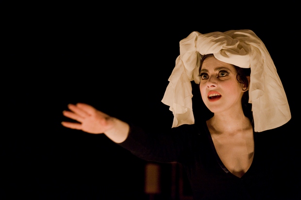 Louise Moaty © Nathaniel Baruch Proximité ? me direz-vous, Proximité quand on nous inflige une prononciation prétendue restituée qui éloigne de nous notre propre langue ? On ne peut nier les problèmes scientifiques que pose la prononciation dite restituée, surtout en-dehors du théâtre tragique. Si certains faits sont à peu près certains (le “oi” prononcé [wə] ou [wɛ]), d’autres le sont moins. Prononçait-on vraiment les finales ? Mais au-delà de ces débats philologique, c’est la portée artistique de cette prononciation qui intéresse les Eugène Green, Benjamin Lazar et Louise Moaty. Oui, elle crée une distance avec le texte, elle le fait texte et non pas langage courant, paroles littéraire ou dramatique et non parole de tous les jours. Son principal attrait réside sans doute dans la musicalité qu’elle permet — qu’elle autorise du moins, si elle ne l’impose pas. On se laisse porter, emporter. Que certains trouvent cela ridicule, paysan, patoisant, c’est leur problème ; c’est surtout un problème d’habitude et d’acclimatation culturelle. Car après tout, en quoi le son [wa] sonnerait-il plus noblement que [wə] ? Un [ʀwa] est-il meilleur roi qu’un [rwə] ? Au cours de cette veillée, quatre contes nous sont donc déclamés par Louise Moaty. Déclamés non seulement, mais encore mis en gestes, illuminés, dansés, chantés, en un mot : incarnés. Car Louise Moaty fait tout cela. Et les chants sonnent, doux, peut-être petits, mais si charmants, et un peu occidentaux. On sera plus sceptique sur les chorégraphies, ni orientales ni occidentales, manquant un peu d’imagination et de rêve. Le dispositif scénique est simple mais efficace. La lumière est au centre des attentions, avec seulement quelques dalles posées au sol et un petit meuble admirable de sobriété et de richesse dramaturgique à la fois. Tout cela crée un espace avec peu, espace presque vide et presque plein, rempli par le texte, la musique, l’action scénique et notre imagination. On admire également le parti judicieux qui est tiré des moindres accessoires. Les costumes, en effet, manquent un peu de brillant, mais quelle inventivité autour d’un simple tissu blanc tantôt ceinture, tantôt voile, tantôt drap, nappe, filet, turban…