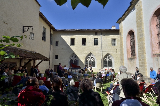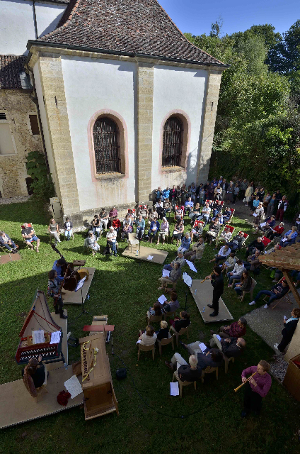 C’est une fin de matinée dans un jardin ensoleillé, le petit jardin de l’abbaye d’Ambronay. Il y a des pupitres, il y a un clavecin et un orgue, il y a une contrebasse et un violone. Plus inhabituel : il y a des chaises, mais elles ne sont pas disposées en rangées ordonnées, et il y en a même entre les pupitres, le clavecin et la contrebasse… D’ailleurs il y a aussi des chaises longues. Ce n’est donc pas tout à fait un concert ordinaire. "Ce concert permet au public de s’immerger au milieu des cinq musiciens de l’ensemble Cafébaum", dit la notice, qui indique également que "l’ensemble est composé d’élèves issus du département de musique ancienne de la Schola Cantorum de Bâle et du Conservatoire d’Amsterdam", foyers pionniers de la musique ancienne. "Ils s’intéressent au répertoire des XVIIe et XVIIIe siècle en ayant à cœur de renouveler les dispositifs de concert" — ce qui explique une disposition inhabituelle, mais aussi que les hautboïstes entrent et repartent parfois même en jouant, se répondent aussi parfois du jardin à une fenêtre… On pourra regretter que les tambours de la fanfare choisissent précisément le bel adagio central de la sonate de Zelenka, superbe de tension et d’introspection, pour se faire entendre au loin ; on pourra aussi regretter que le public applaudisse à la fin de presque chaque mouvement, morcelant d’autant le discours musical. Un cadre agréable et plus décontracté a aussi ses inconvénients. Bon, tout cela est bien gentil, me direz-vous, mais qu’en est-il de la musique, dans l’affaire ? Hé bien, c’est peut-être bien là que réside la qualité essentielle de l’ensemble Cafébaum : ces musiciens ne se contentent ni de bouger et de se disposer bizarrement, ni de jouer excellemment : ils font les deux à la fois. Il faut dire que le programme choisi est d’une exigence redoutable : point de pièces trop faciles ici, et les sonates en trio de Zelenka et des frères Pla sont connues pour leurs difficultés techniques ; Haendel au reste ne ménage pas non plus les efforts des musiciens.