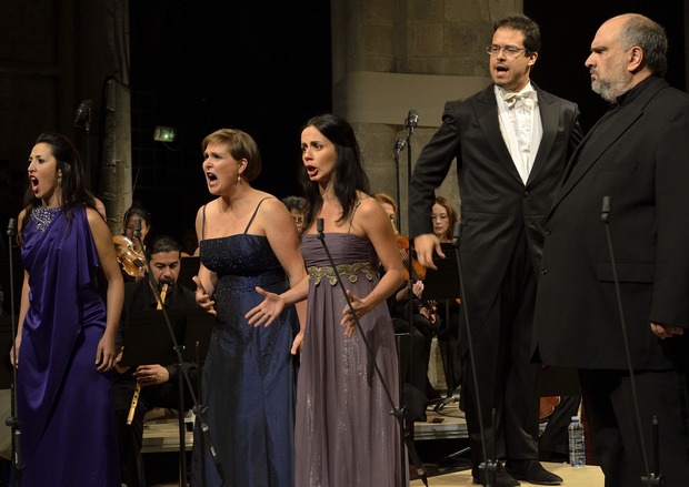 © Bertrand Pichène / CCR d'Ambronay, 2012 La Cappella Mediterranea, ses solistes et le chœur de chambre de Namur, menés par l’enthousiaste Leonardo García Alarcón, traversent ces pages avec une aisance confondante, renouvelant perpétuellement ses sonorités amènes. Alarcón a choisi d’aller plus loin ici que dans le Diluvio où il faisait déjà appel à des percussions orientales : il leur adjoint ici le ney et le duduk. Si ce choix est discutable et peut ne pas faire l’unanimité, voire agacer, une chose est certaine : ces "effets" sont employés avec parcimonie et même avec sagesse. D’abord, le sujet, dont le lieu est la Mésopotamie, justifie ces interventions orientalisantes. Par ailleurs, elles ne prennent à aucun moment le pas sur la qualité et la précision de la musique écrite, ce sont des "bonus". Certes, tel ou tel prélude de ney ou de duduk surprend, voire choque, mais à bien des moments les deux instruments s’intègrent dans l’orchestre, tout comme les percussions de Keyvan Chemirani, jamais envahissantes. On ne peut qu’admirer le passage insensible, dans le "Risolvo morire", des sonorités orientales à la polyphonie recherchée de Falvetti et à son aspect on ne peut plus occidental. Ce qui frappe, en tout cas, c’est l’équilibre permanent de la Cappella Mediterranea. Leonardo García Alarcón maîtrise son ensemble et sait en tirer des sonorités à la fois surprenantes et évidentes — l’évocation de l’Euphrate avec d’abord les cordes pincées seules, puis les cordes frottées avec les sourdine, laisse stupéfait. Et quand les voix de Mariana Flores (l’Idolâtrie) et Capucine Keller (l’Orgueil) entrent, là encore, quelle évidence ! Chaque moment semble pesé soigneusement en regard de ce qui suit et ce qui précède, autant que dans chaque moment chaque ingrédient musical et sonore est idéalement disposé. Dans cet écrin, les solistes s’épanouissent avec bonheur. Certes, la voix de Fabián Schofrin, élément le plus faible de la distribution, manque de puissance dans tout le médium, et peine par moments à se faire entendre, mais à côté de lui, le Nabucco de Fernando Guimarães n’en semble que plus royal, plus éclatant, plus impérieux. La voix est belle et homogène, le timbre clair et riche, le discours clair et merveilleusement phrasé — le tout dans un rôle de méchant assez ingrat, qui ne réserve au fond pas beaucoup de véritables airs (mais tout de même le très touchant "Per non vivere felice"). Des qualités semblables se retrouvent dans son rival indirect, le sage prophète Daniel auquel Alejandro Meerapfel prête sa voix de basse ample, rassurante, admirable de nuances et de couleurs — une voix qui colle idéalement à son personnage. Sommets de la partition, les trios et les airs des enfants font entendre des voix qui s’unissent jusqu’à la fusion, mais qui, quand elles se dissocient, séduisent encore autant. À Caroline Weynants (Ananias) revenait le premier des trois airs, "Tra le vampe d’ardenti fornaci", dans lequel sa voix claire et émouvante dialoguait avec cordes pincées et basse de viole avec ductilité. Lui succédait immédiatement, dans l’air "La mia fede dal fuoco nasce", Marianna Flores, dont la voix chaleureuse a animé maints moments de la soirée d’un sens de la ligne et du phrasé enchanteur. La troisième intervention, celle de Magdalena Padilla Flores, nous a paru légèrement en retrait, sans doute pour une question de tessiture : la voix s’épanouissait pleinement dans le haut médium, mais il était peu sollicité, tandis que la partie grave de la tessiture, moins puissante chez Magdalena Padilla Flores, l’était davantage ; le rôle de Misaël aurait, peut-être, gagné à s’incarner dans un mezzo-soprano plutôt qu’un soprano. Rien de déshonorant toutefois ! Il serait fastidieux de citer encore un par un tous les autres solistes ; disons-le : ils étaient tout de même exemplaires. L’excellent Chœur de chambre de Namur se joignait à eux avec ses caractéristiques habituelles : un son à la fois plein et fin, clair et riche, une articulation souple et une maîtrise souveraine, y compris quand seuls quelques-uns de ces membres prenaient la parole, pardon : le chant. On a le sentiment profond d’avoir eu face à soi une équipe invitée par son chef à la générosité musicale et à l’enthousiasme pour la pièce interprétée. C’est une œuvre, une lecture et une soirée dont on ressort un peu ébloui et en tout cas souriant. Il paraît qu’une autre partition a été retrouvée récemment…