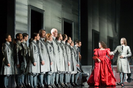 Acte III © Alvaro Yañez Le reste de la tragédie bénéficie d'une mise en scène plus soignée, avec des éclairages très réussis. En pleine cohérence avec l'idée de base (pour mémoire : Paul Agnew s'endort sur le lit de la Chambre du Roi lors de sa visite guidée), Carsen reproduit en les stylisant le lit à baldaquin et la balustrade du royal centre du monde. L'esthétique est malheureusement "branchée" baignant dans des tons argentés (réminiscences de l'Atys de Villégier ?), faisant irrémédiablement songer à un clip MTV ou à du marketing de produits cosmétiques de luxe, impression renforcée par la scène du sommeil où femmes et hommes couvrent Renaud de roses rouges sur un plateau aussi noir que désertique. Ce parti-pris scénique s'épuise au fur et à mesure de la représentation, et devient rapidement décoratif. Le contexte guerrier, le choc des civilisations (Armide est une sarrasine, Renaud un croisé), les dilemmes cornéliens entre Amour et Gloire sont effacés au profit d'une histoire banale d'amour déçu au sein de la jet set. Le moment le plus inspiré aura été un changement de perspective lors de l'Acte V, au cours duquel le public se retrouve derrière la balustrade, du côté du lit, alors que les deux amants s'ébattent et que Paul Agnew se dandine en caleçon). Plusieurs légèretés de Carsen sont impardonnables : des reprises non prévues, des coupures intempestives (notamment tout l'acte V scène 3 qui ne permet plus de comprendre pourquoi Renaud quitte Armide), et surtout le suicide d'Armide en totale contradiction avec le livret. Certains hausseront les épaules avec résignation, et agiteront leur index en prononçant un sentencieux "Je m'en doutais, il a déjà fait le coup chez Alcina". Dans ce monde lunaire à l'épure glacée évoluent les costumes peu marquants de Gideon Davey : pour les hommes un mélange d'un débraillé trendy façon Kenzo mélangé avec les hauts de chausse et souliers à talons rouges de la fin du XVIIème ; pour les femmes, robes rouge vif ou nuisettes. La distinction est d'ailleurs très artificielle, les deux sexes se retrouvant souvent vêtus de la même manière, offrant dès lors l'effroyable vision de Laurent Naouri, barbu, chantant la Haine en robe écarlate. Les danses de Jean-Claude Gallotta apportent le réconfort d'une vision personnelle. Entre maccaréna, tektonik et danses baroques, les chorégraphies s'inscrivent dans la perspective d'un baroque dévoyé, nerveux, parfois sensuel. Les danseurs aux évolutions saccadées, comme victimes de décharges électriques se cherchent, se croisent et ne se trouvent pas. La Passacaille de l'Acte V est ainsi un festin de rendez-vous manqués, de danses de salon inachevées et douloureuses. On louera au passage la rigoureuse coordination des danseurs.