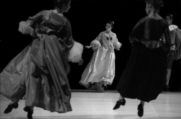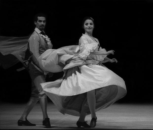 D.R. Le spectacle s’ouvre donc dans le décor d’Atys, mais les costumes aux couleurs vives de Patrice Cauchetier tranchent avec ceux qu'ils a également conçu pour l'opéra du Roy, plus monochromes. Ici, les justaucorps et robes apportent une note de gaité et de fantaisie, affirmant d’emblée la nuance de ton qui sépare la tragédie lyrique (et Atys compte parmi les plus funestes) de la légèreté des danses festives. Les entrées en scène, souvent courues, contribuent à élaborer au fil des chorégraphies un rythme enlevé : les danseurs donnent l’impression d’être dans la hâte d’exposer leurs talents, rappelant ainsi que l’âge baroque est aussi celui de l’art la mise en scène – ici, de soi-même, de son propre corps et de sa maîtrise technique, proposé à l’admiration des spectateurs. La bande-son qui vient régulièrement interrompre l’enchaînement des danses introduit également une forme de regard distancié porté sur le spectacle : des voix et des rires s’entremêlent, dont la nature fait hésiter entre un enregistrement de répétitions – et c’est l’arrière-scène et la conception du spectacle qui s’affichent alors sous nos yeux, resituant en une forme de mise en abyme la théâtralité dans son caractère fictionnel -, et une imitation d’un second public, virtuel celui-là, peut-être celui de la Cour ? – mimesis nous replongeant dans l’atmosphère des spectacles du Grand Siècle, animés de part et d’autre de la scène… Les danses à deux, comme celle de la Sarabande de Tancrède de Campra, jouent d’ailleurs sur la peinture de cette sociabilité particulière et élaborent une vision dynamique des rapports entre les danseurs, qui par la gestuelle baroque se rapprochent, s’éloignent, puis se retrouvent, dans des évocations presque romanesques incitant l’imagination à broder des canevas narratifs autour des personnages. Les jeux de regard, suggestifs, contribuent à structurer l’espace, de même que les lentes déambulations qui laissent admirer au passage le chatoiement des tissus. A ces duos répondent en alternance des solos parfois virtuoses comme celui, remarquable, de La gavotte et ses doubles de Rameau, dont le clavecin au rythme rapide et aux temps forts marqués a permis à Francine Lancelot de livrer une chorégraphie complexe, emplie d’équilibres aériens sur demi pointes et de tours en l’air plus athlétiques. La danse semble véritablement ici exprimer les sentiments musicaux, les interpréter, dans une pureté formelle dégagée de toute intention narrative.